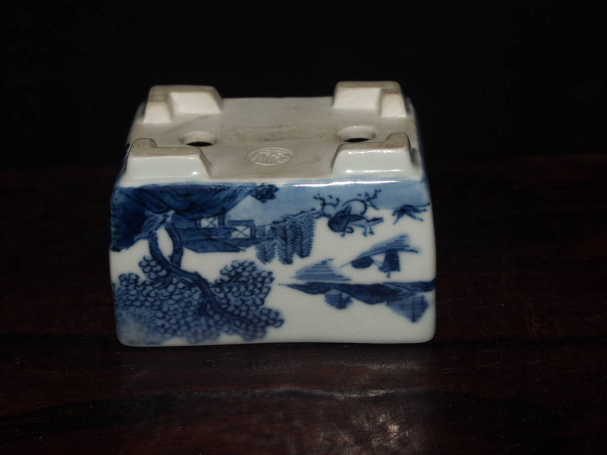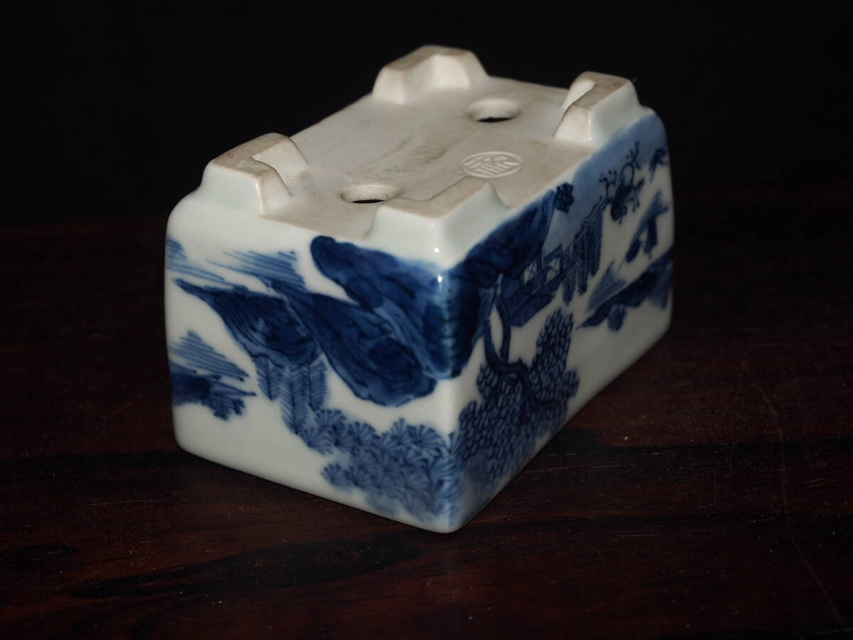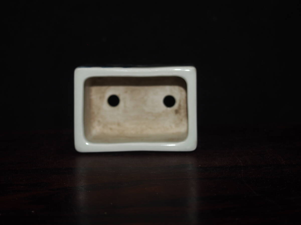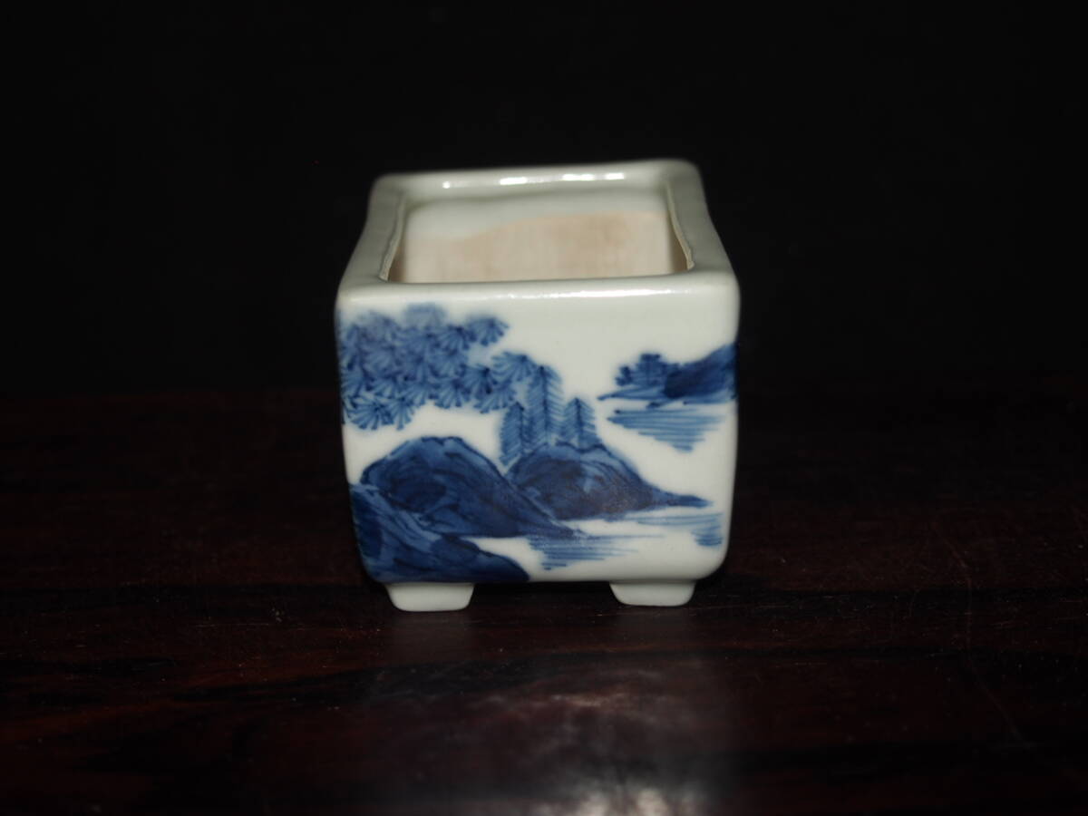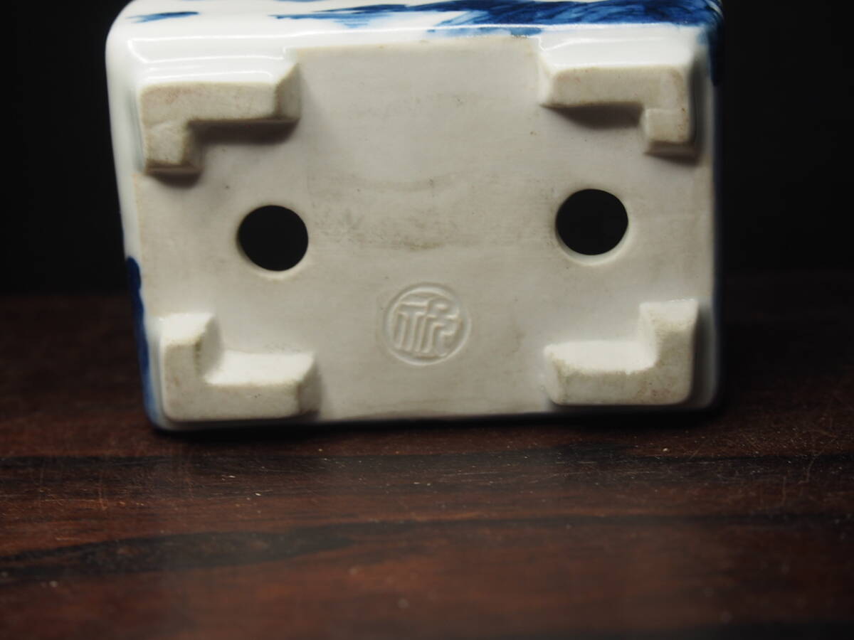 『大和魂』【先代祝峯】染付山水騎馬賢人図反縁切脚長方鉢・巾6.5cm・氏の代表格絵付・時代付・箱付・人気物故作家 | ||