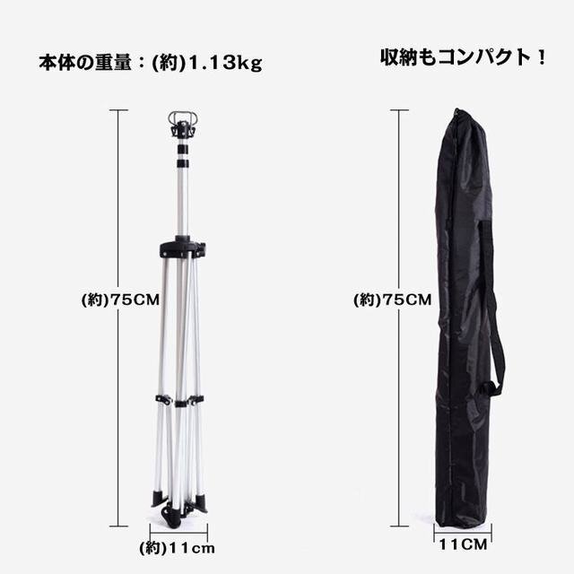 【商品内容】:ランタンスタンド 【サイズ】:(約)幅55cm×奥行47cm 【高さ調整】:(約)87.5cm~195cm 【収納サイズ】:(約)75cm×11cm 【重量】:(約)1.13kg 【素材】:アルミ 【耐荷重】:(約)20kg