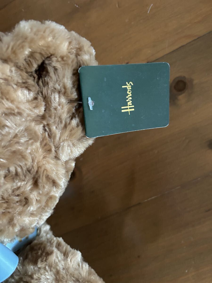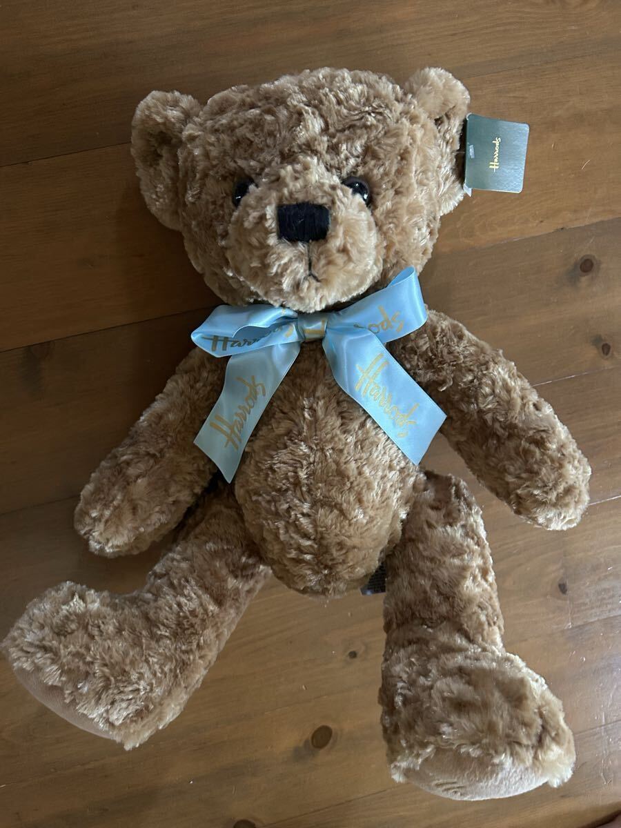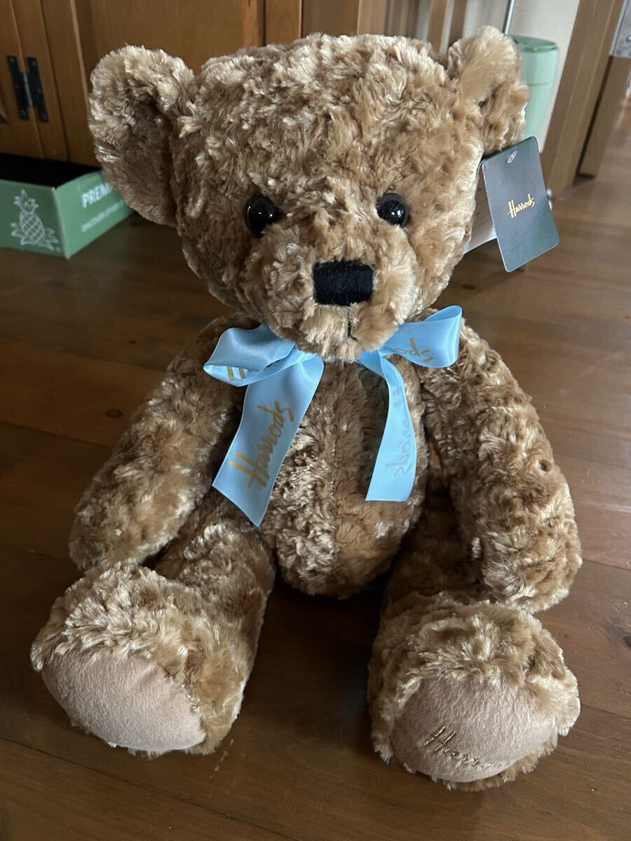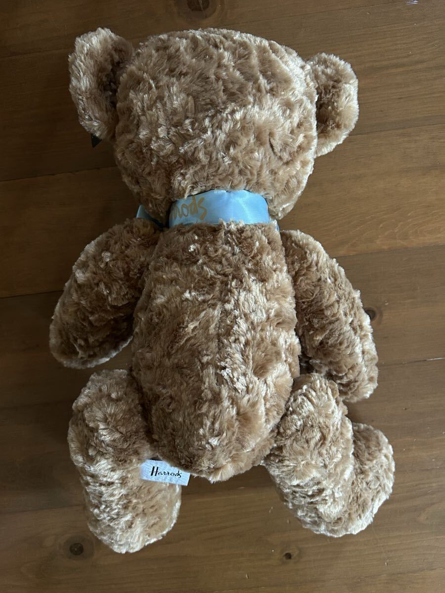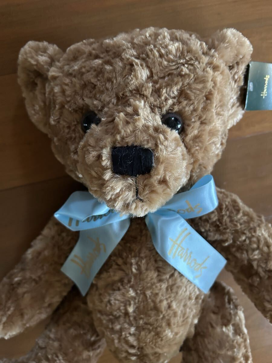 タグ付きの英国ハロッズのテディベアです。サイズは足を伸ばして約46センチです。ちゃんとお座りできます。座ると約36センチです。飾っておりましたが、小さな子供やペットを飼っておりませんので比較的綺麗な状態だと思います。優しいお顔の可愛いテディベアです。ノークレーム・ノーリターンでお願い致します。