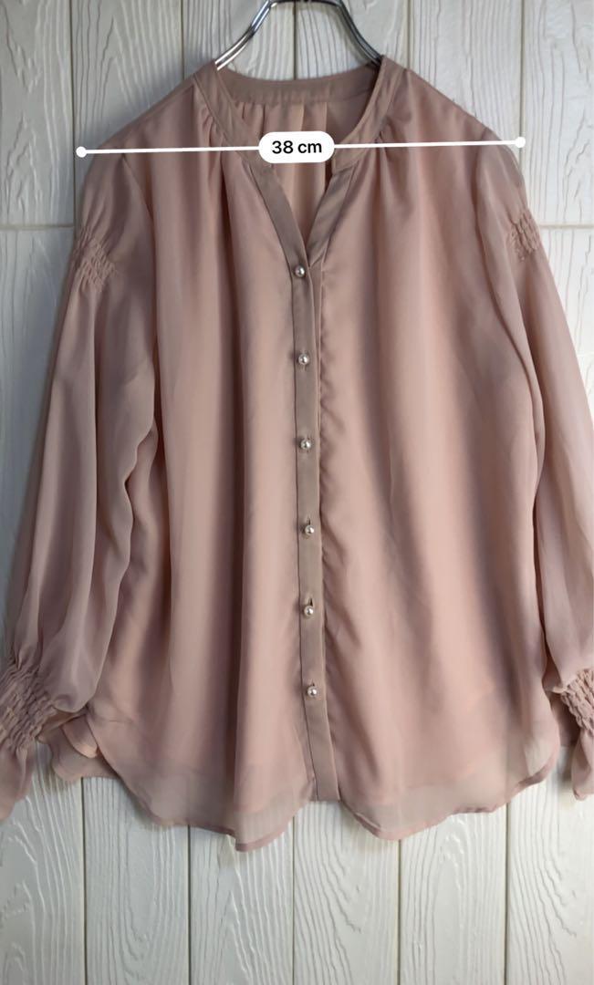 柔らかなシフォン素材のピンクの長袖ブラウス、ボタン付きでエレガントなデザイン。