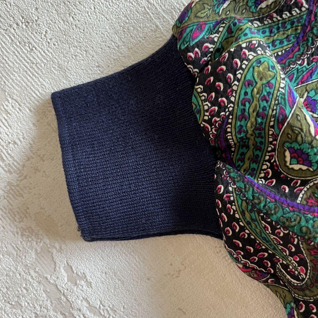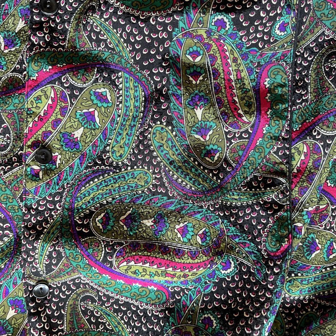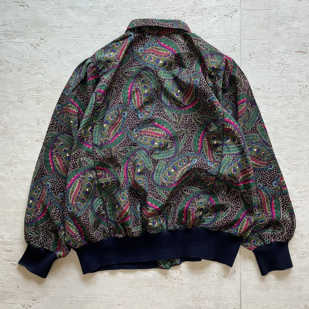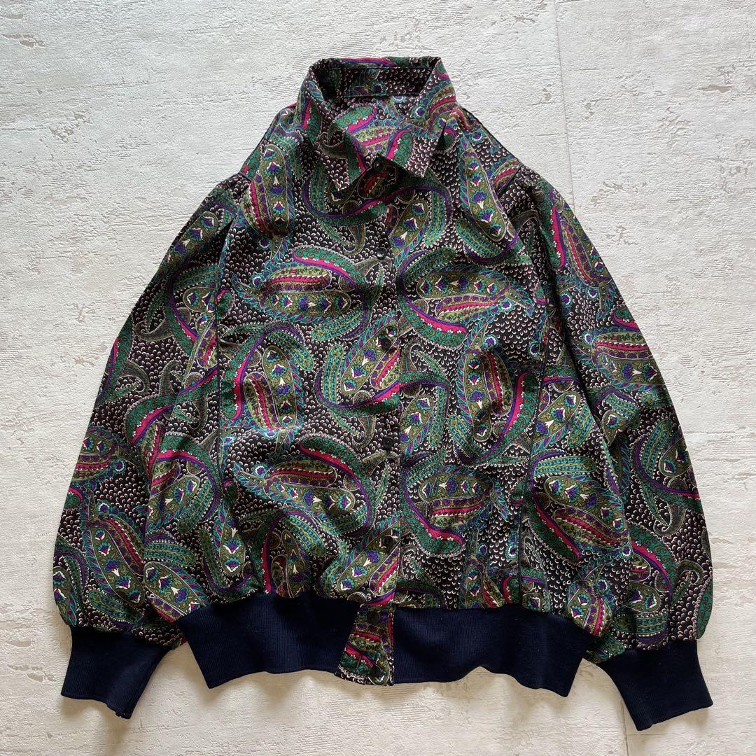 深みのあるブラックベースに、グリーン・パープル・ピンクのペイズリー柄が映えるレトロブルゾンです。