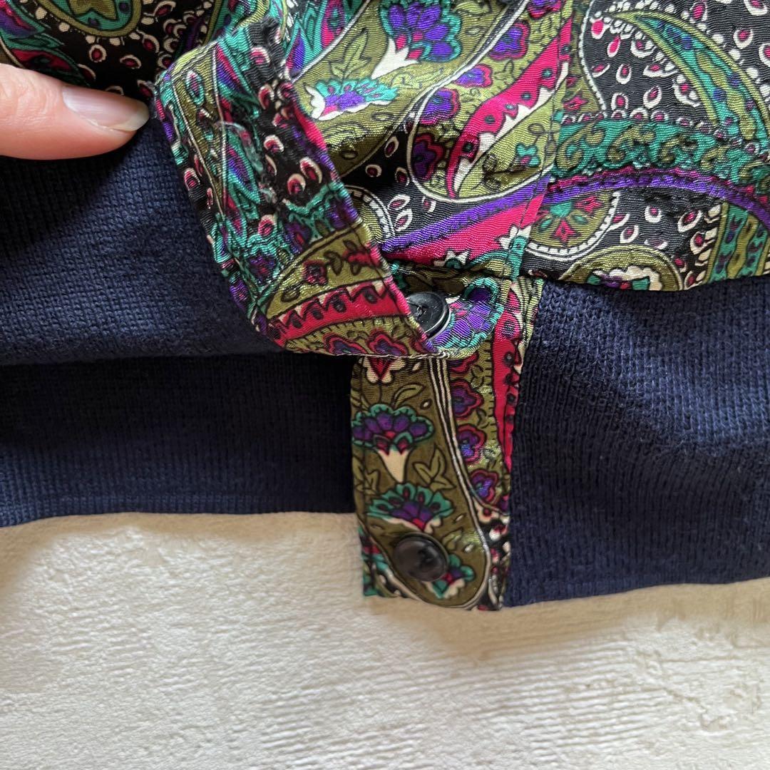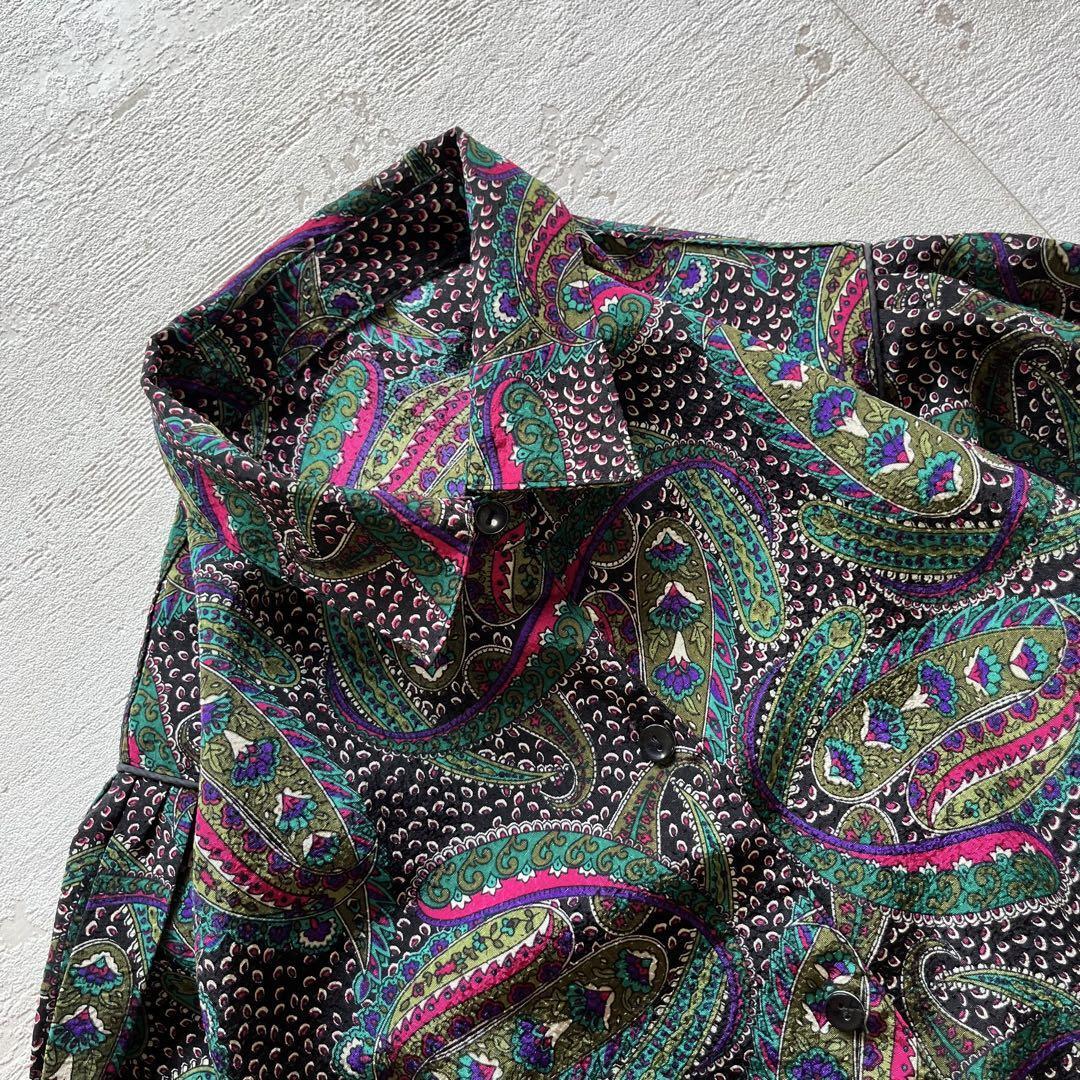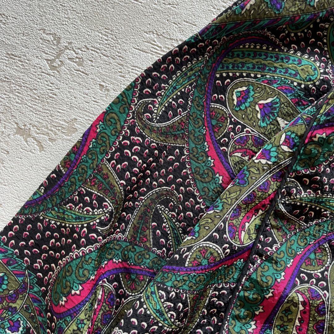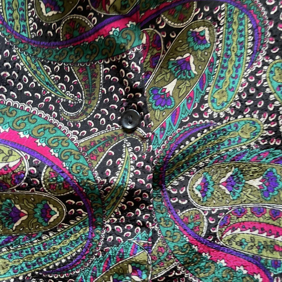 深みのあるブラックベースに、グリーン・パープル・ピンクのペイズリー柄が映えるレトロブルゾンです。