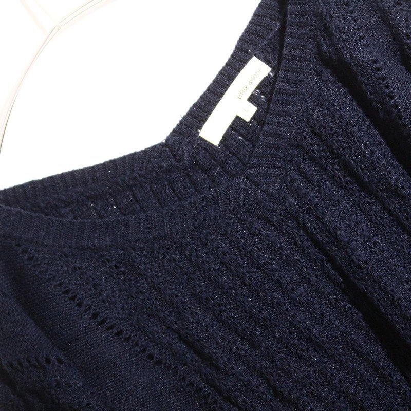 美品 ピンクアドべ pink adobe 株) ワールド ゆったり レース編み フリンジ ニットセーター L ネイビー 紺 合物 春 秋 冬 重ね着 デザイン