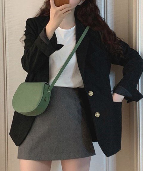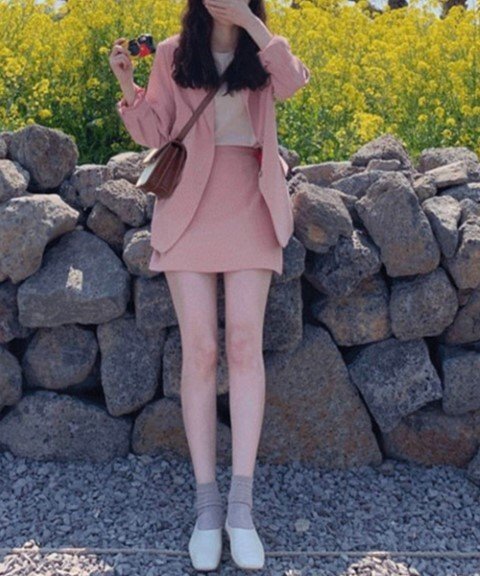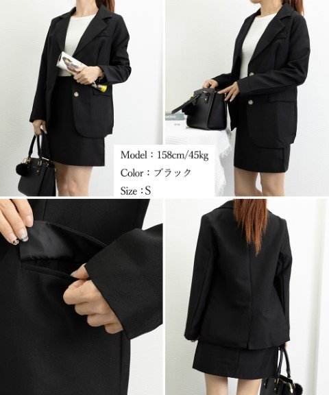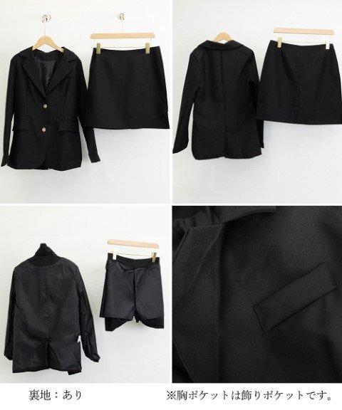 ゆったりとしたジャケットとミニタイトスカートのセットアップです。