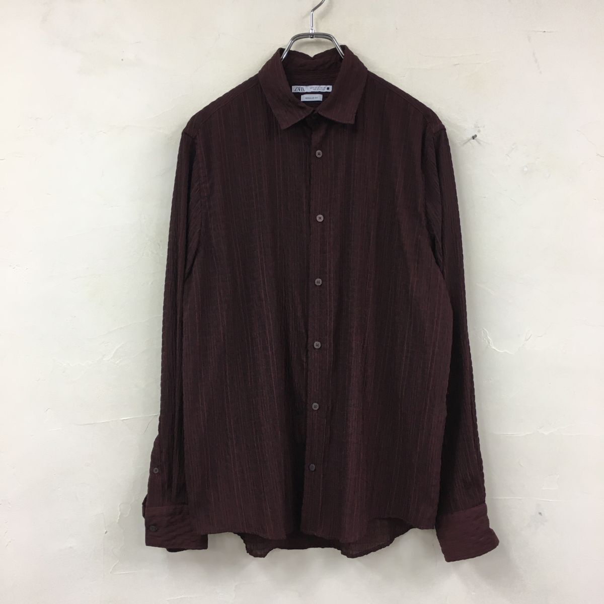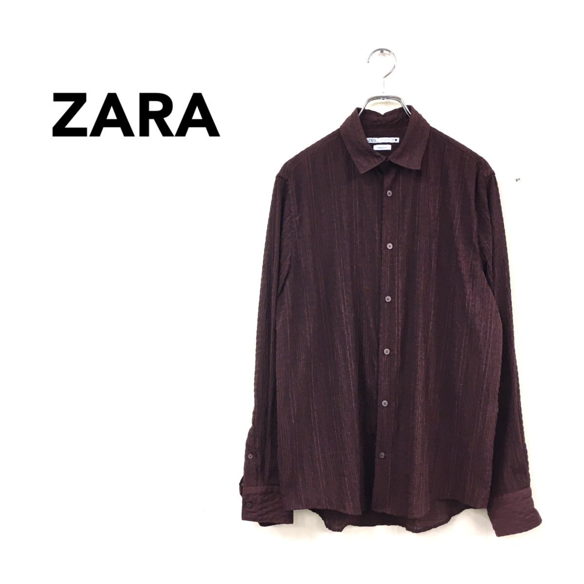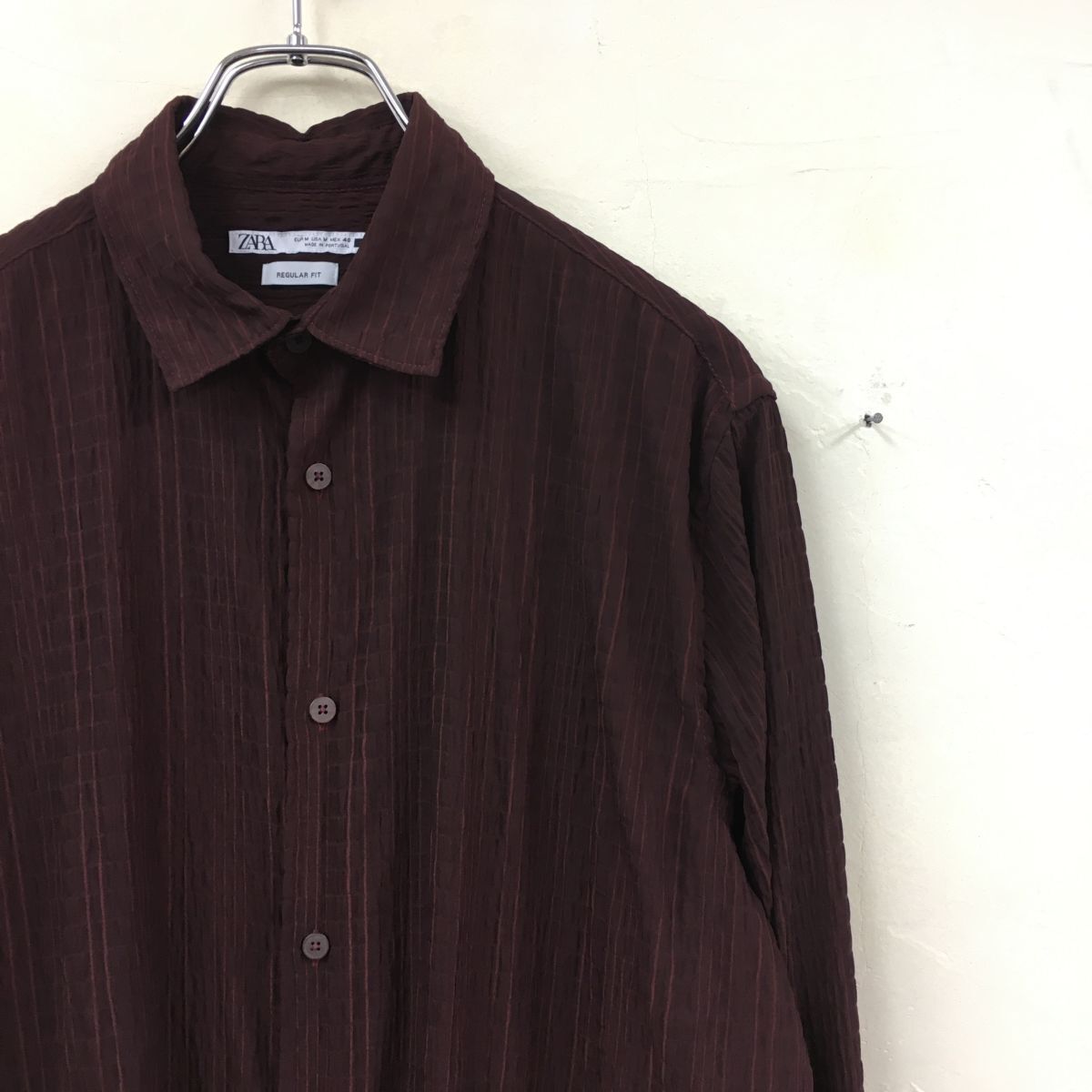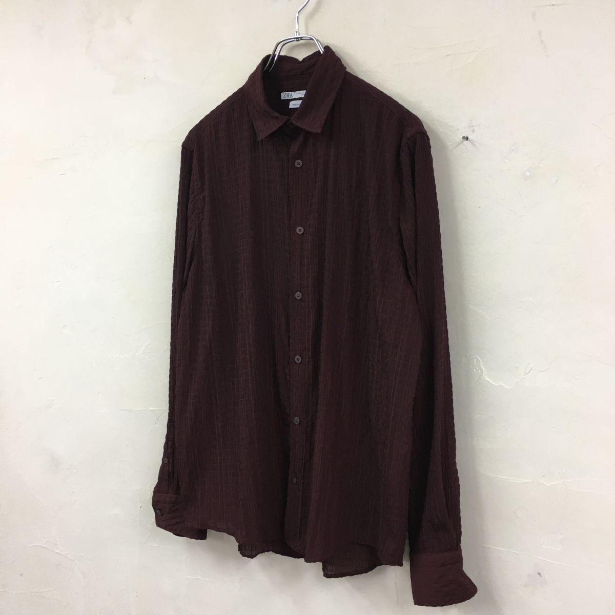 2O1893-G-N◆ ZARA ザラ シアーチェックリンクルシャツ 長袖 ラウンドヘム レギュラーフィット ◆ sizeM ブラウン ポリエステル