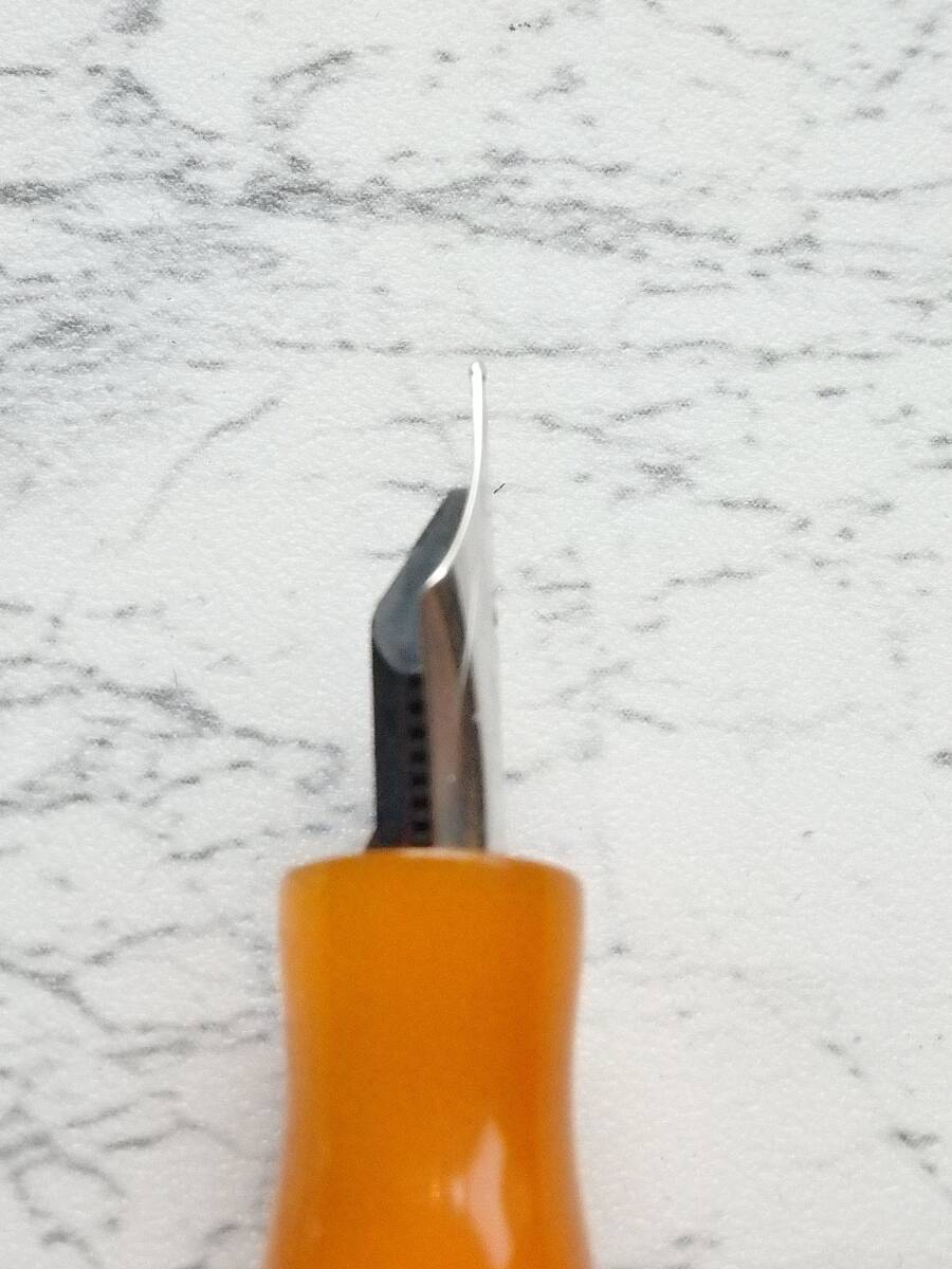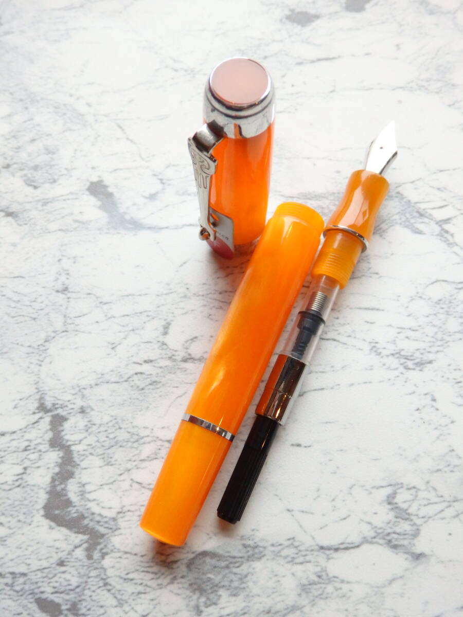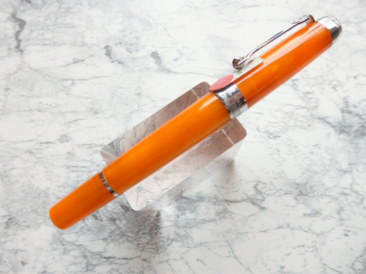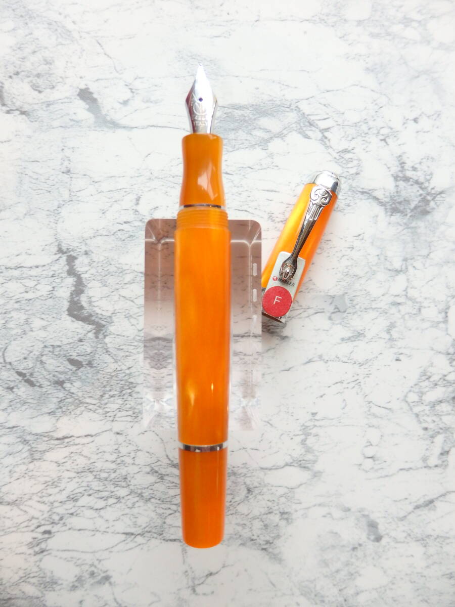 オレンジのマザーオブパールのイタリアンレジンがとても美しい万年筆で、ニブはハーモニックスティールニブ※のFです。