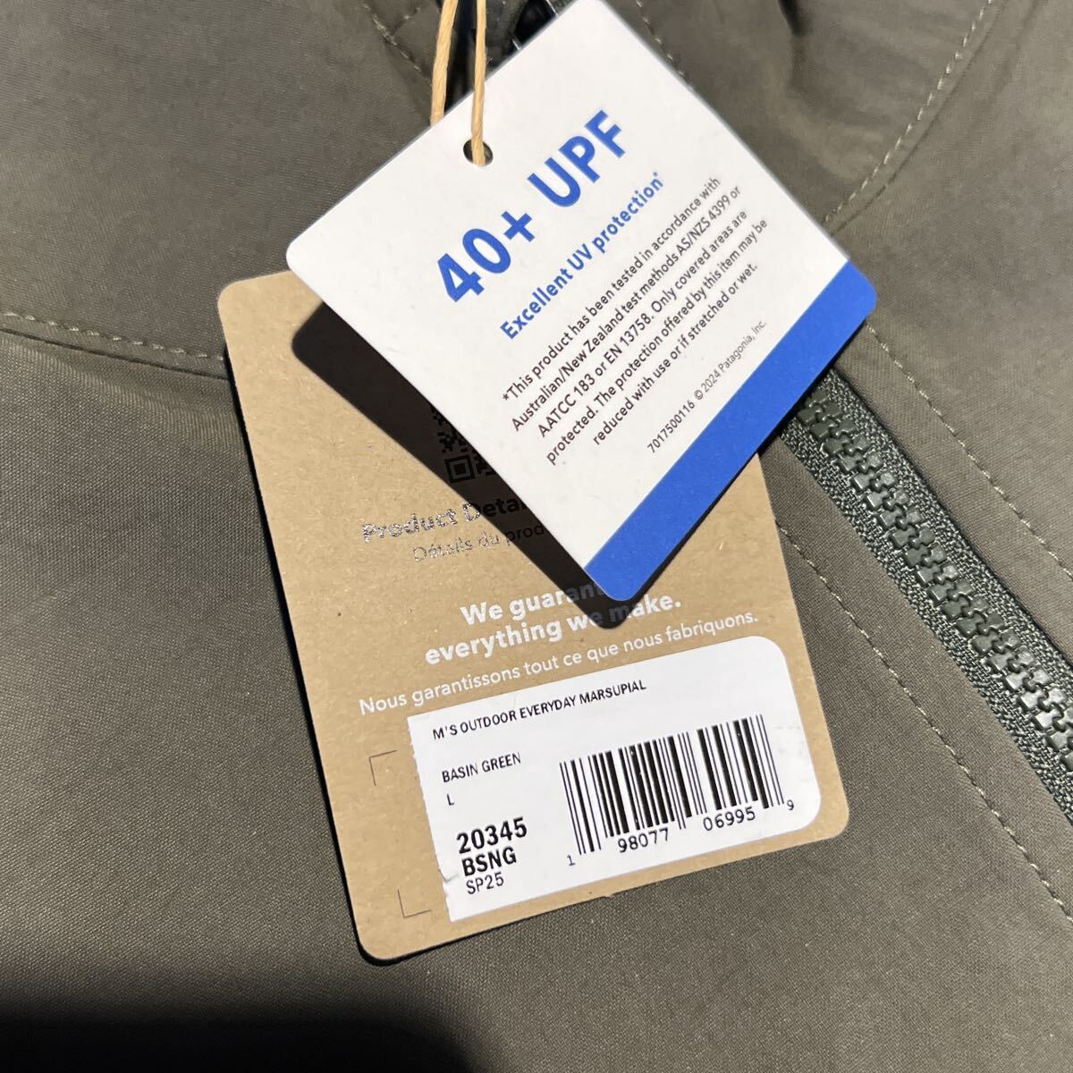 パタゴニアのメンズ アウトドア エブリデー マースピアルの未使用品、サイズL、カラーbasin green、実寸肩幅48cm、身幅62cm、着丈72cm、袖丈69cmです。