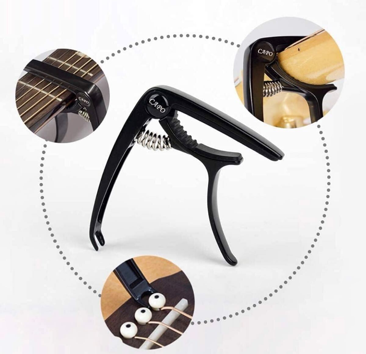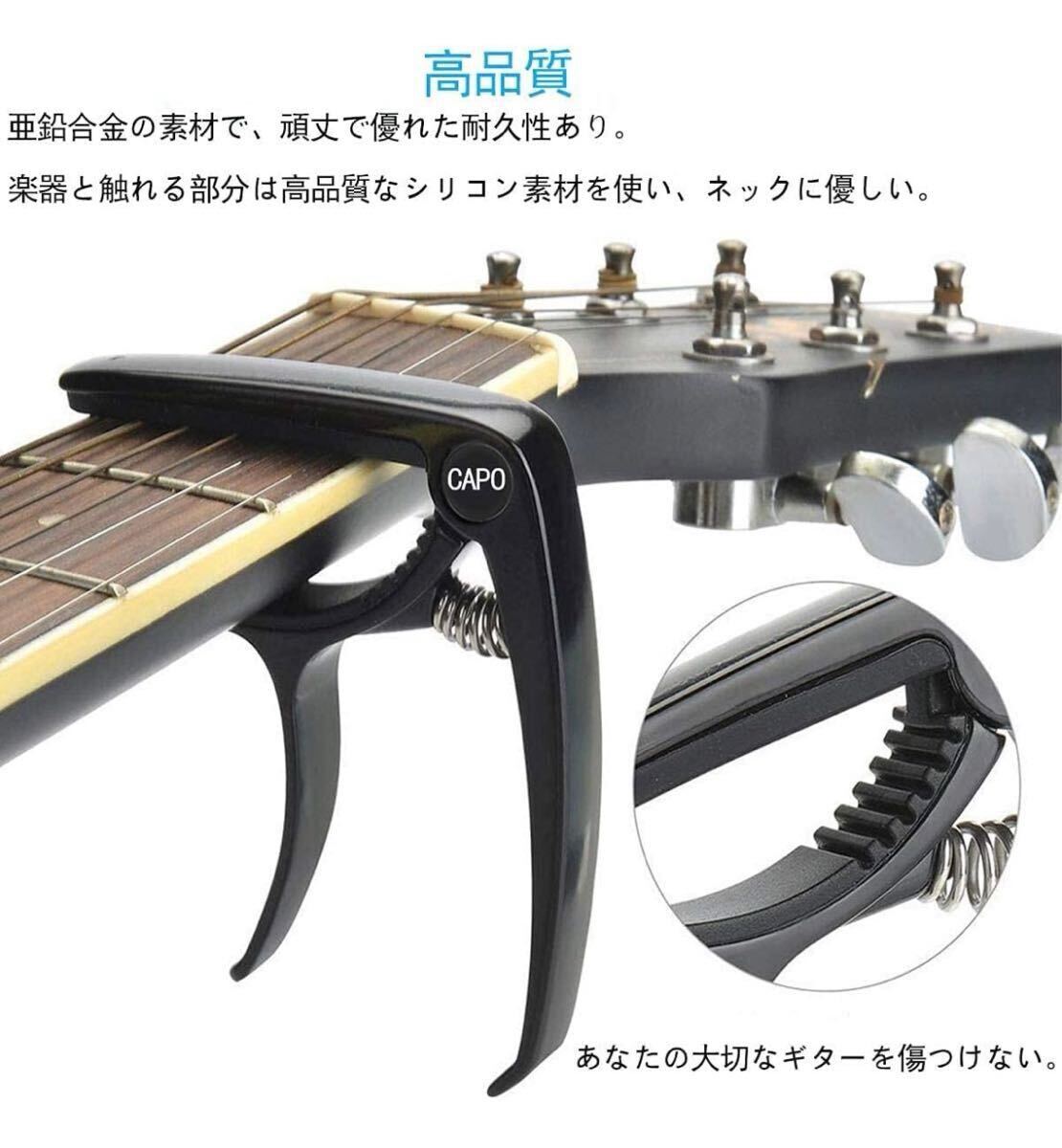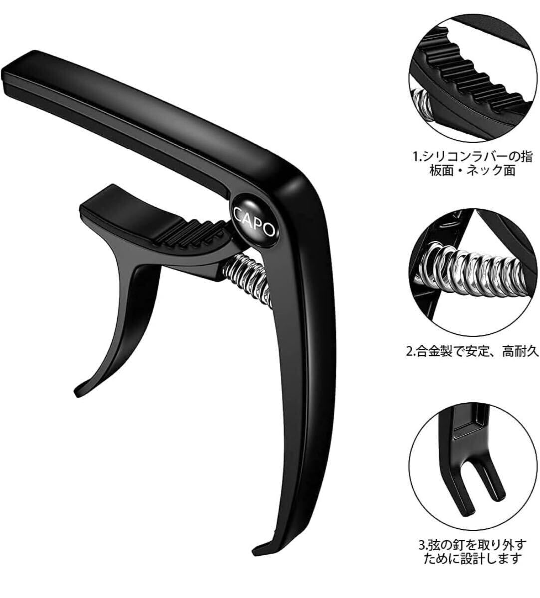 カポタスト は高品質の亜鉛合金 採用。軽量性 と 耐久性 を同時に実現しました。また、高性能復位鋼製スプリング,優れた耐疲労性、実用的です。カポタスト部分柔らかい厚 シリコーン製で大切なギターのネックを傷つけることなく、均等な力で押さえます。
