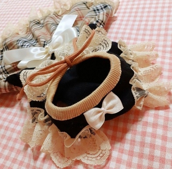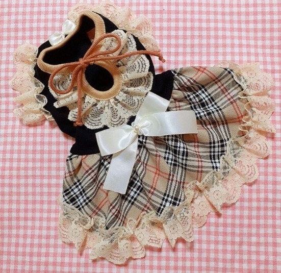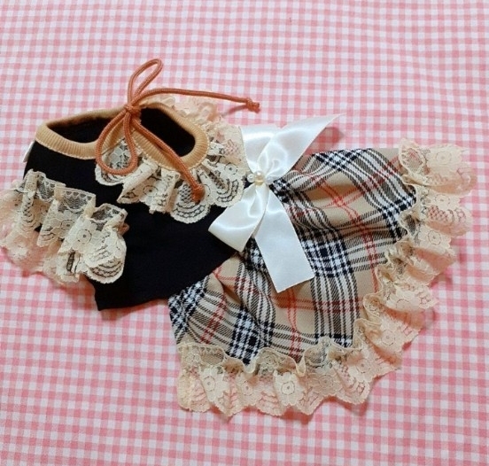 黒ニットに、ベージュ系チェックスカートを合わせました。レースは、ベージュラッセルレースです。 仕上がりサイズ 胴31cm、丈24cm | |||