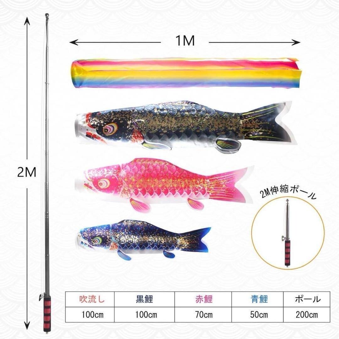 鯉のぼりセット こいのぼり 1M 吹き流し 金箔 鯉 3匹 2m伸縮旗ポール付 庭園 お庭 ベランダ用 室内用 日本語説明書カード付き こどもの日