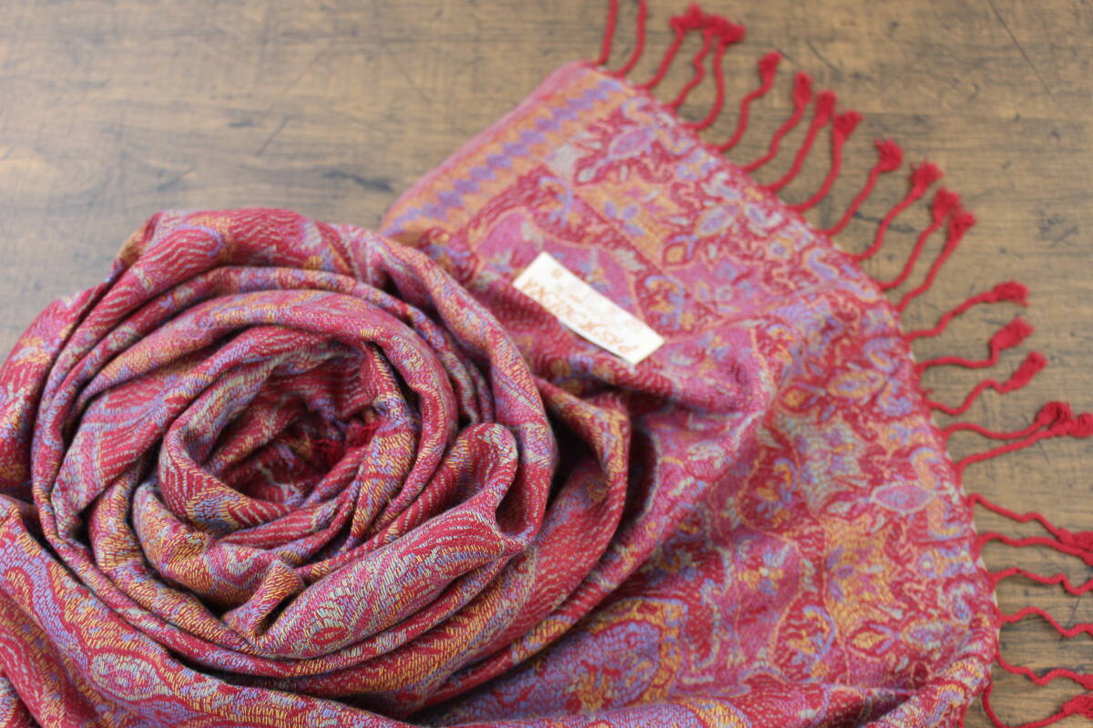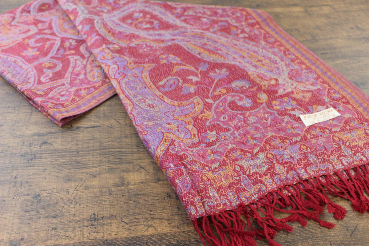 新品【パシュミナ Pashmina】ペルシャ柄 レッド系マルチカラー 赤 RED 大判 ストール カシミア100% Cashmere