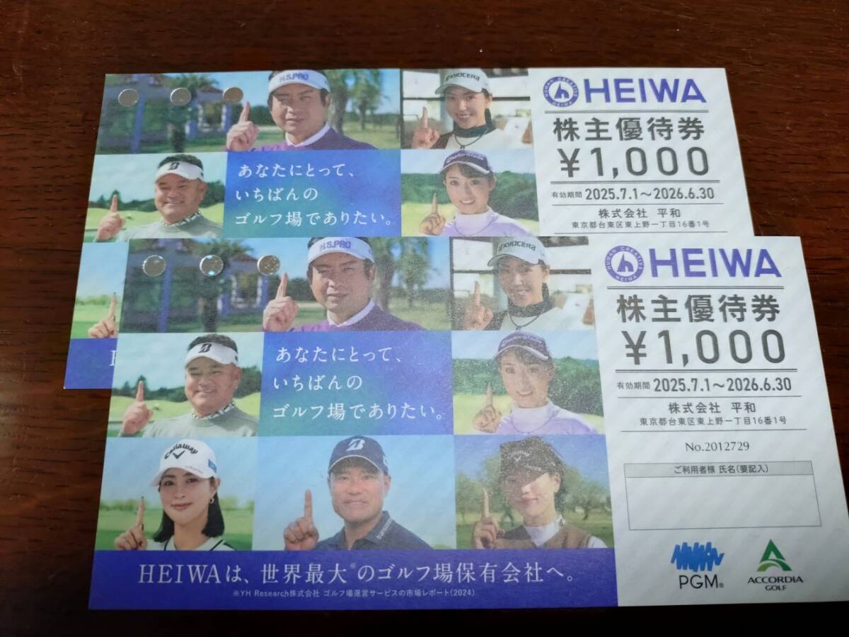 ★商品説明★ | HEIWA 株主優待券2000円分です。 平和グループのゴルフ場で使用いただけます。 (土日祝は利用できない月がありますのでHP等でご確認ください) 有効期限は、2026年6月末日までです。 当方利用したことがないため詳細の利用可能日、利用可能なゴルフ場、注意事項等の詳細はHPなどでご確認ください。 |