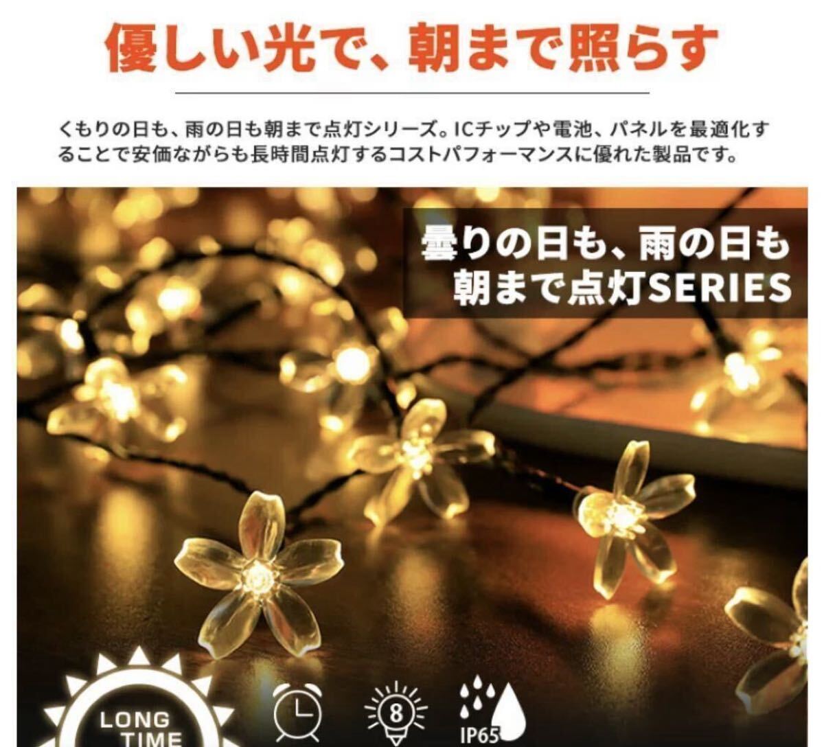 今までおそらく沢山の方がソーラーイルミネーションを購入したことあると思いますが、中に苦い経験ある人もいます。価格が安いですが、充電後8時間点灯できると謳いますが、実際のところせいぜい毎日2-3時間、しかも暗い、雨の日、曇りの日全く付かない。そういう失敗談が散々聞かれています。市販品の中に70%はそういう商品が過言ではありません。
