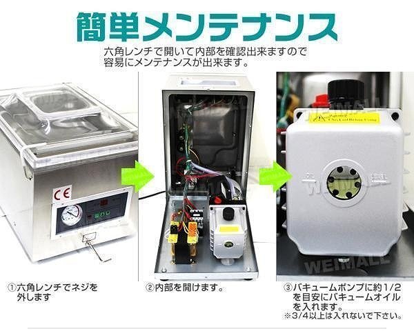 食品卸売業者様やレストラン店にご好評です!! 真空パックをすれば、 ・食品のロスを削減!!冷蔵保管で必要な量だけ使用可能◎ ・加熱料理し真空保存しておけば即座に料理ができあがり♪ ・上手な仕込みで大人数の宴会も対応可能! ・料理済み食品など新鮮なまま搬送可能に◎ ・注文から食品提出までの時間が大幅に短縮! 真空パック用の袋に食材を入れて本体室内にセット! 蓋を閉じて2~3秒しっかり押さえれば、カンタンに真空包装されます。 初心者でもできますよ♪ 【仕様】 材質:ステンレス素材 消費電力:370W 電源:100V(50/60Hz) チャンバー内寸法:380×280×90mm 商品寸法:480×330×360mm 真空速度:1-4pec/min シール幅:260×10mm 重量:35kg 真空パック袋:10枚付属 サイズ:200x260㎜ ・市販の真空袋も使用いただけます。 (最大対応可能サイズ:270mm×325mm) 替えパーツはこちら→ ※写真と実物は多少異なる場合がございます。あらかじめご了承下さい。 |