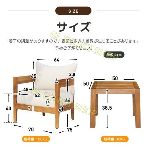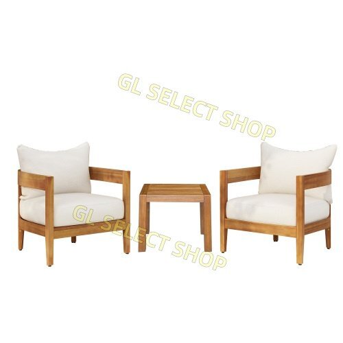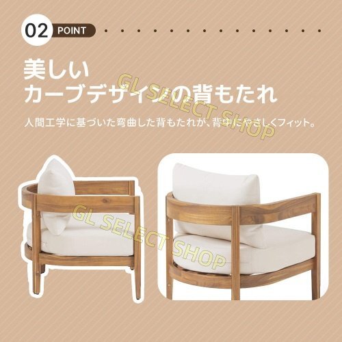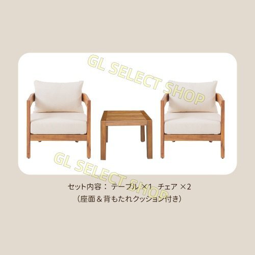 • ◎01天然木の温もりを感じる上質なガーデンセット お庭やベランダでのくつろぎ時間を演出する、アカシア材を使用したガーデンファーニチャー3点セット。天然木ならではの風合いと美しい木目が、自然と調和しながら上品な雰囲気を醸し出します。セット内容: テーブル ×1 チェア ×2(座面&背もたれクッション付き)