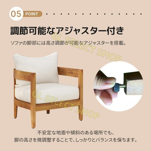 • ◎09調節可能なアジャスター付き ソファの脚部には高さ調節が可能なアジャスターを搭載。不安定な地面や傾斜のある場所でも、脚の高さを微調整することで、しっかりとバランスを保ちます。