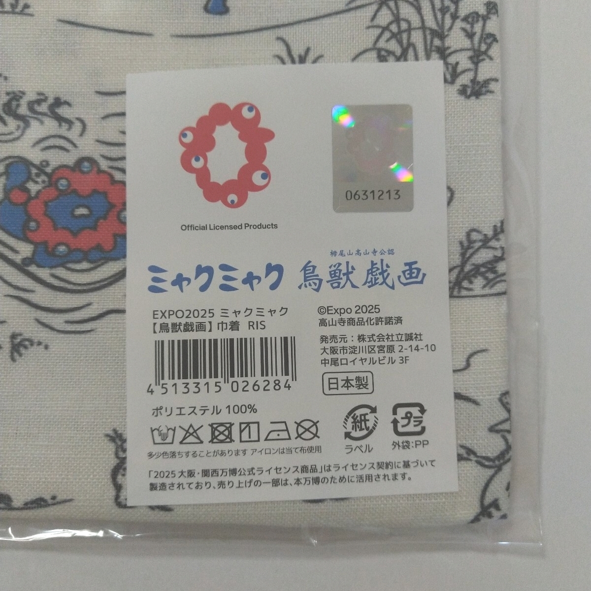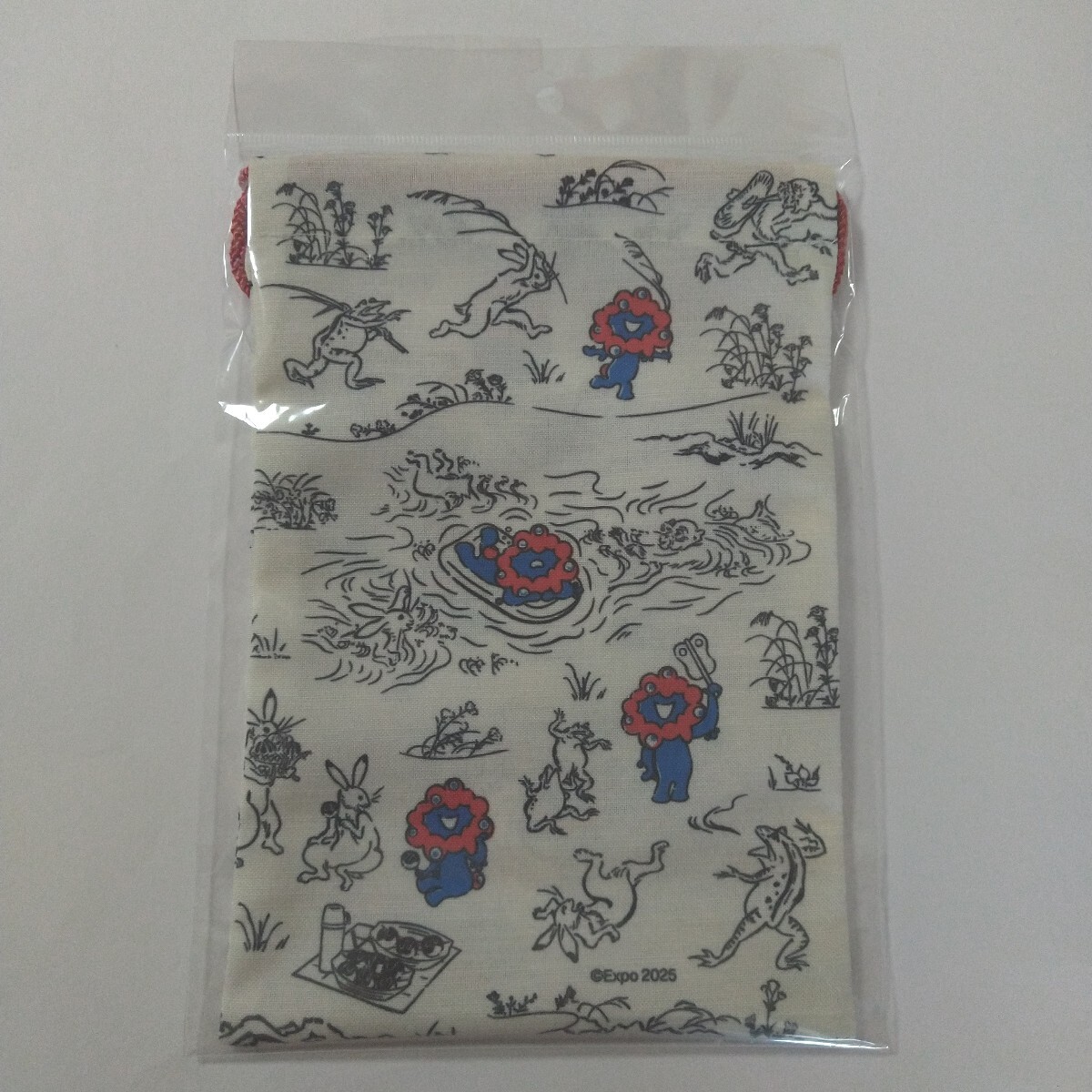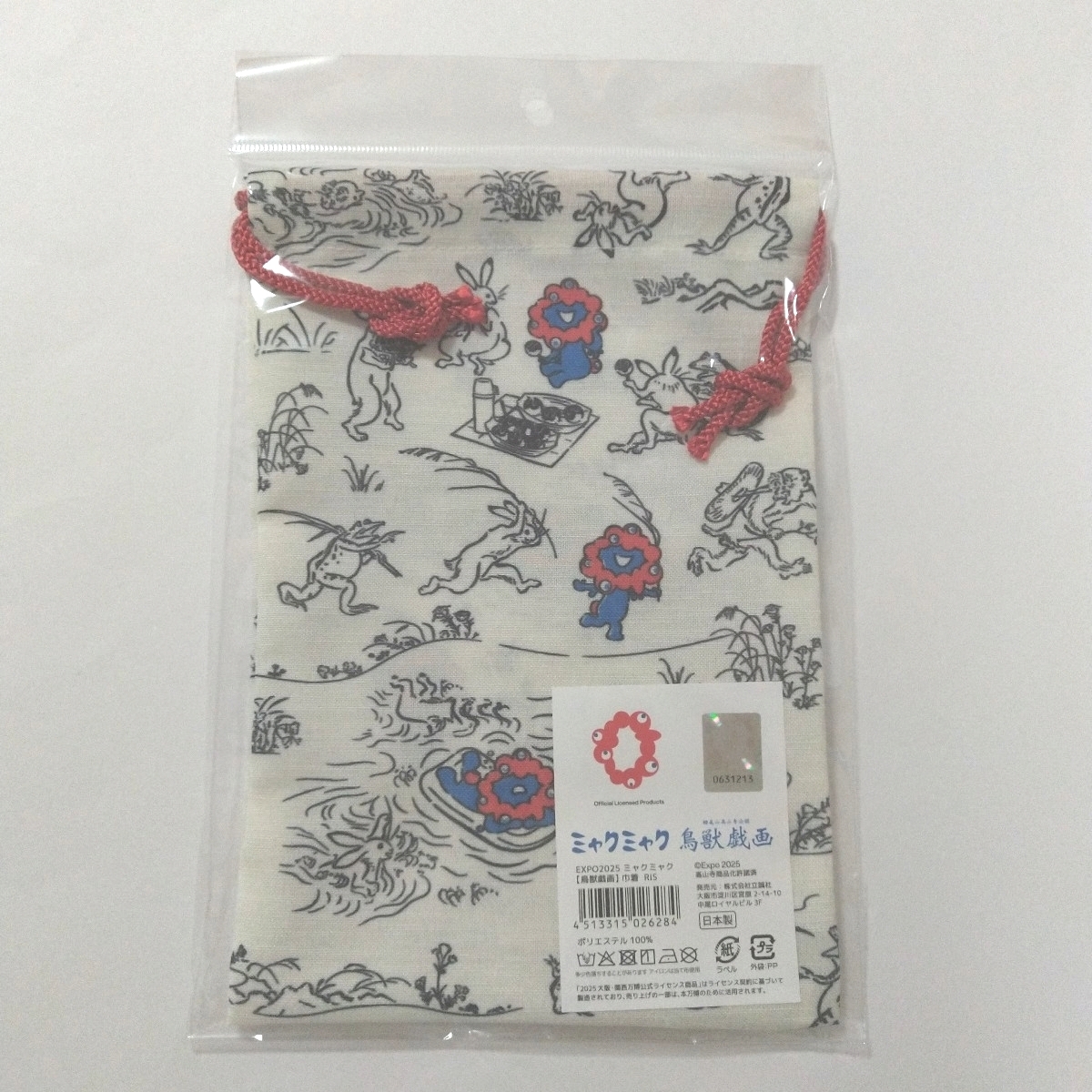 大阪・関西万博公式ライセンス商品、ミャクミャクと鳥獣戯画コラボの巾着です。