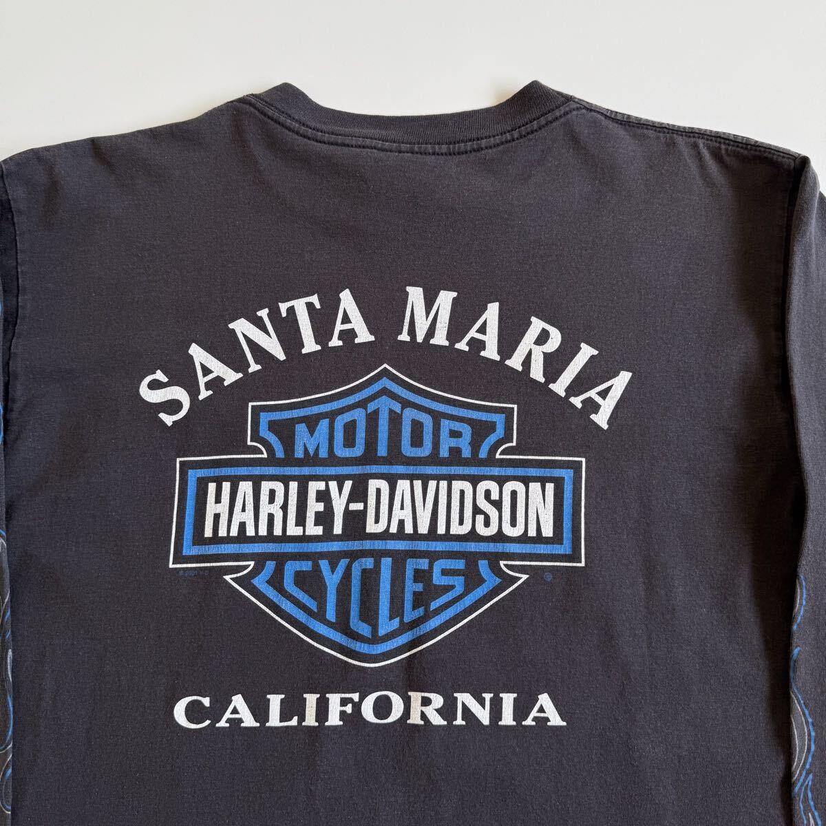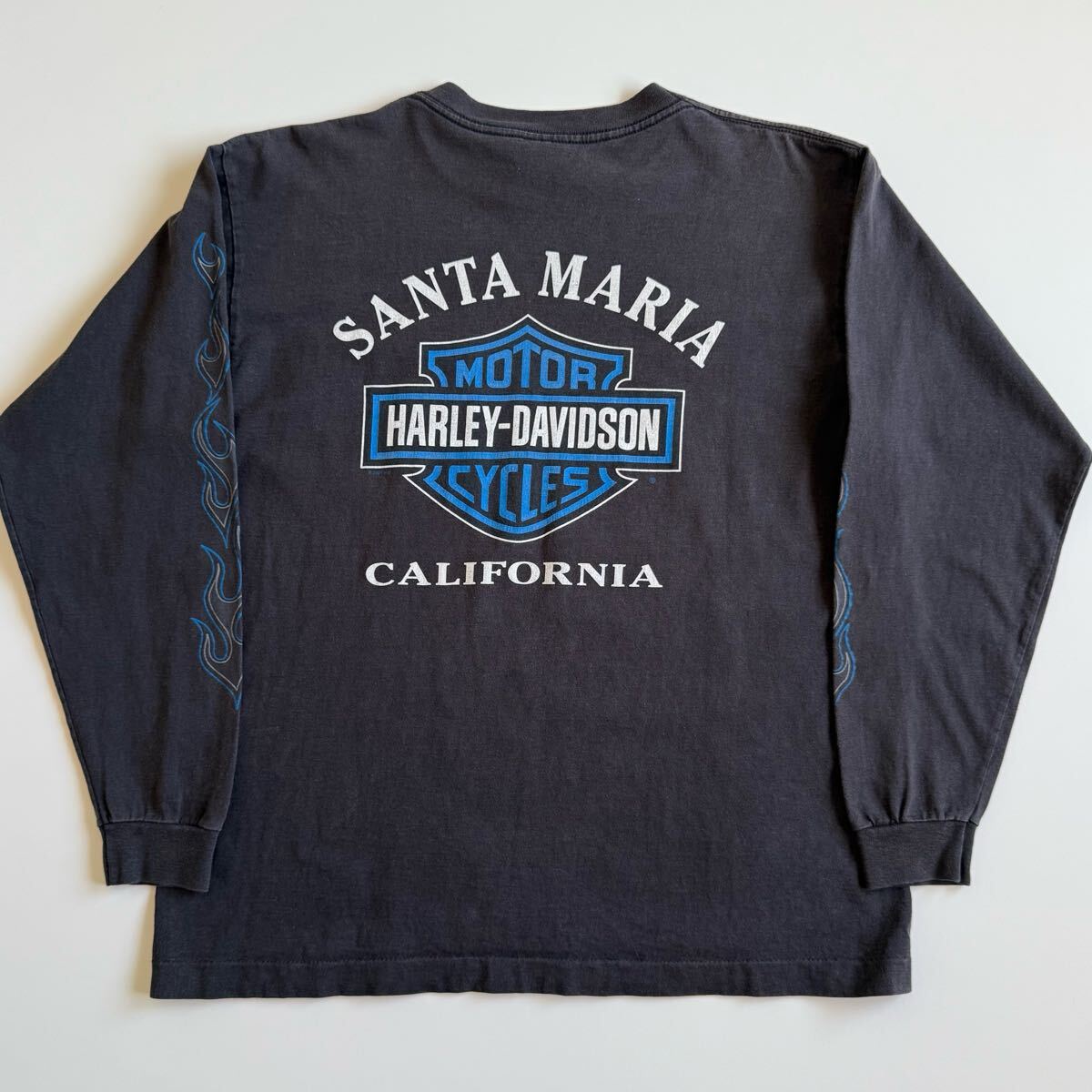 フロントはシンプルなロゴと控えめな袖のフレイムパターン、背面はSANTA MARIA CALIFORNIAのプリント。