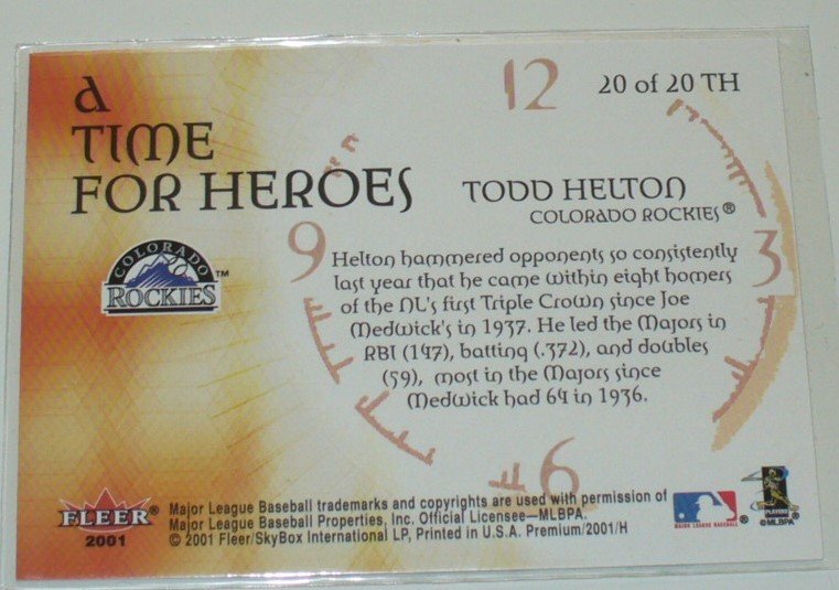 FLEER PREMIUM 2001/COLORADO ROCKIES*TODD HELTON(20 of 20TH)A TIME FOR HEROES