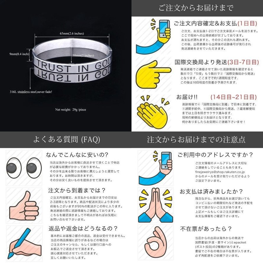 商品タグ等が付属した状態で明らかな初期不良品の場合は、返品・返金のご対応をさせていただきます。万が一初期不良品が届いてしまった場合は、速やかに当店までご連絡ください。 |
