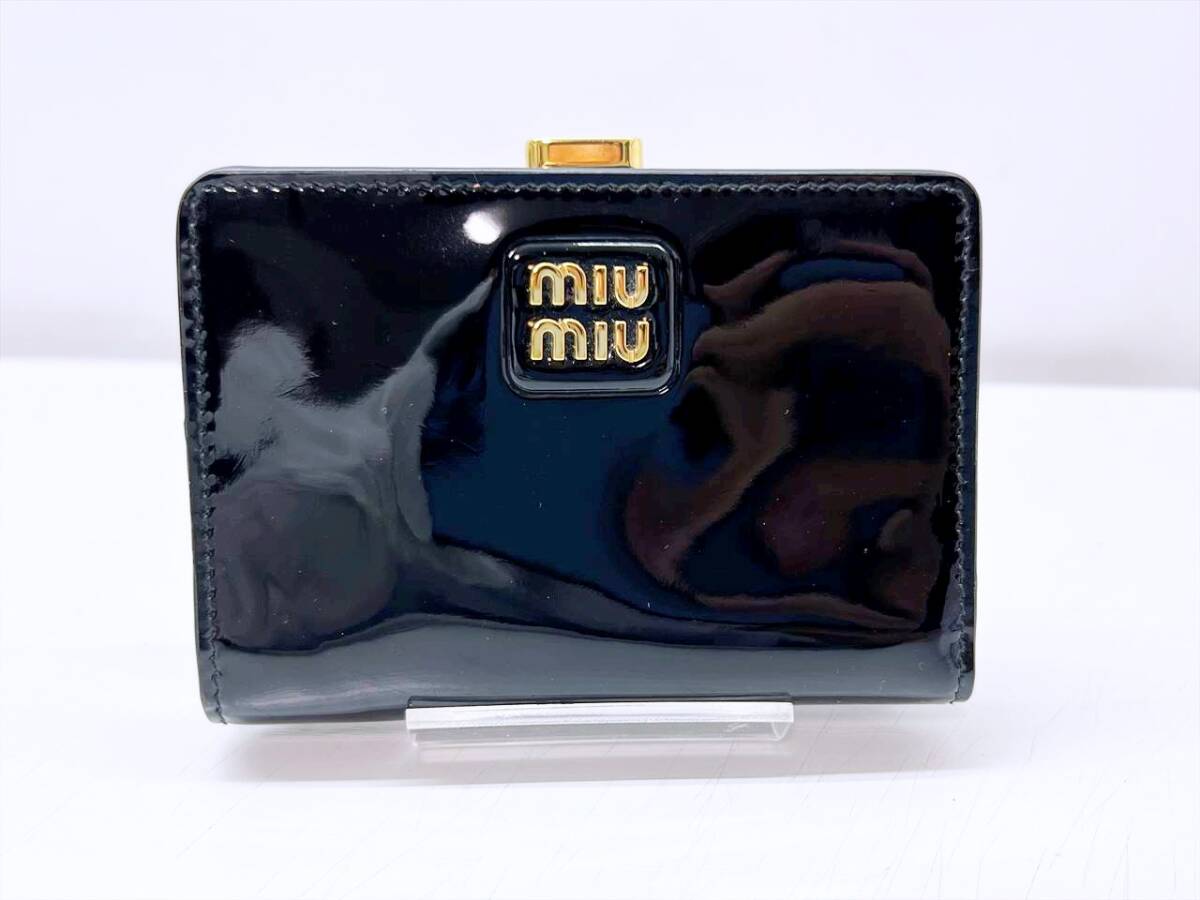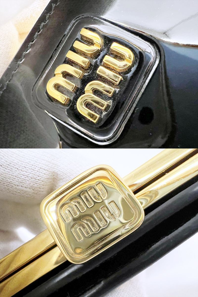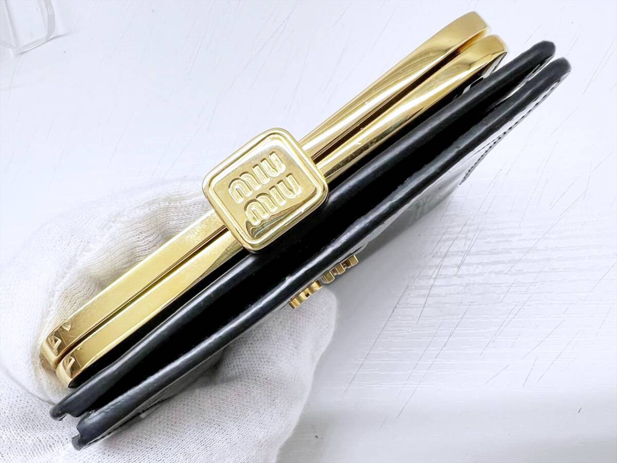 25年現行 MIUMIU ミュウミュウ ロゴ エナメル がま口 二つ折り財布 黒 ゴールド 5ME009