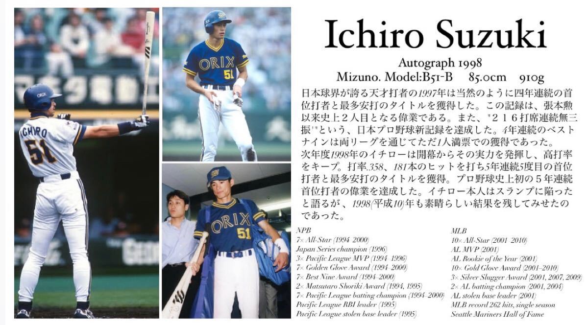 めったに出回らないイチロー選手の首位打者イヤーにいただいたバットです。マークとロゴが変わる寸前ですので非常に希少価値が高く、年々希少価値が上がる逸品だと思います。当時日本に在籍していた最後の方で頂きまして日光に当てずに保管してましたので美品です。素材はかなり木目の詰まったアオダモです。