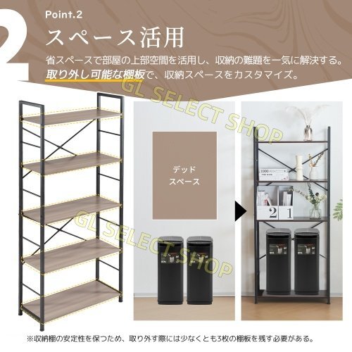 • 2.【大収納力備える5段目ラック付き】ほしいものにすぐ手が届く多段ラックが付いています。シェルフの棚板は耐荷重30kgの頑丈設計で、本やDVD・CDなどをたっぷり収納できます。