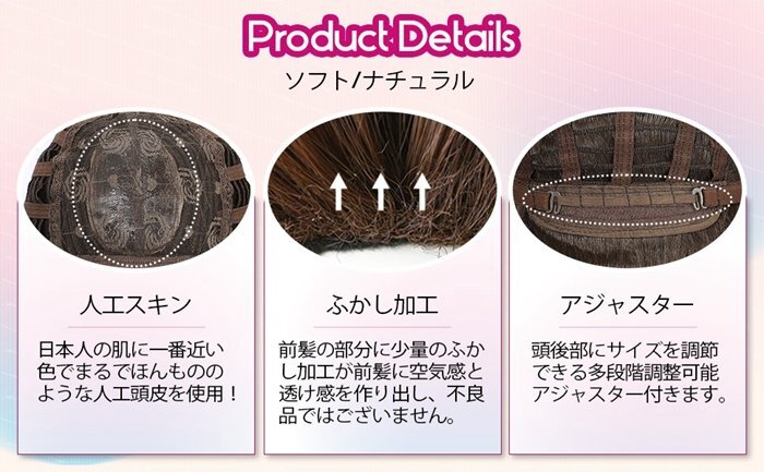 超自然なつむじ:つむじには頭皮に近いカラーの大幅の人工頭皮を採用。トップもふんわりと立ち上がる植え方になり、生え際もより自然に。