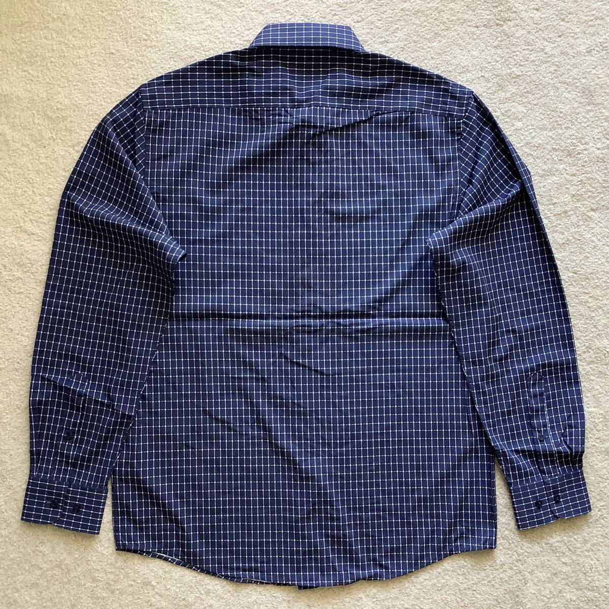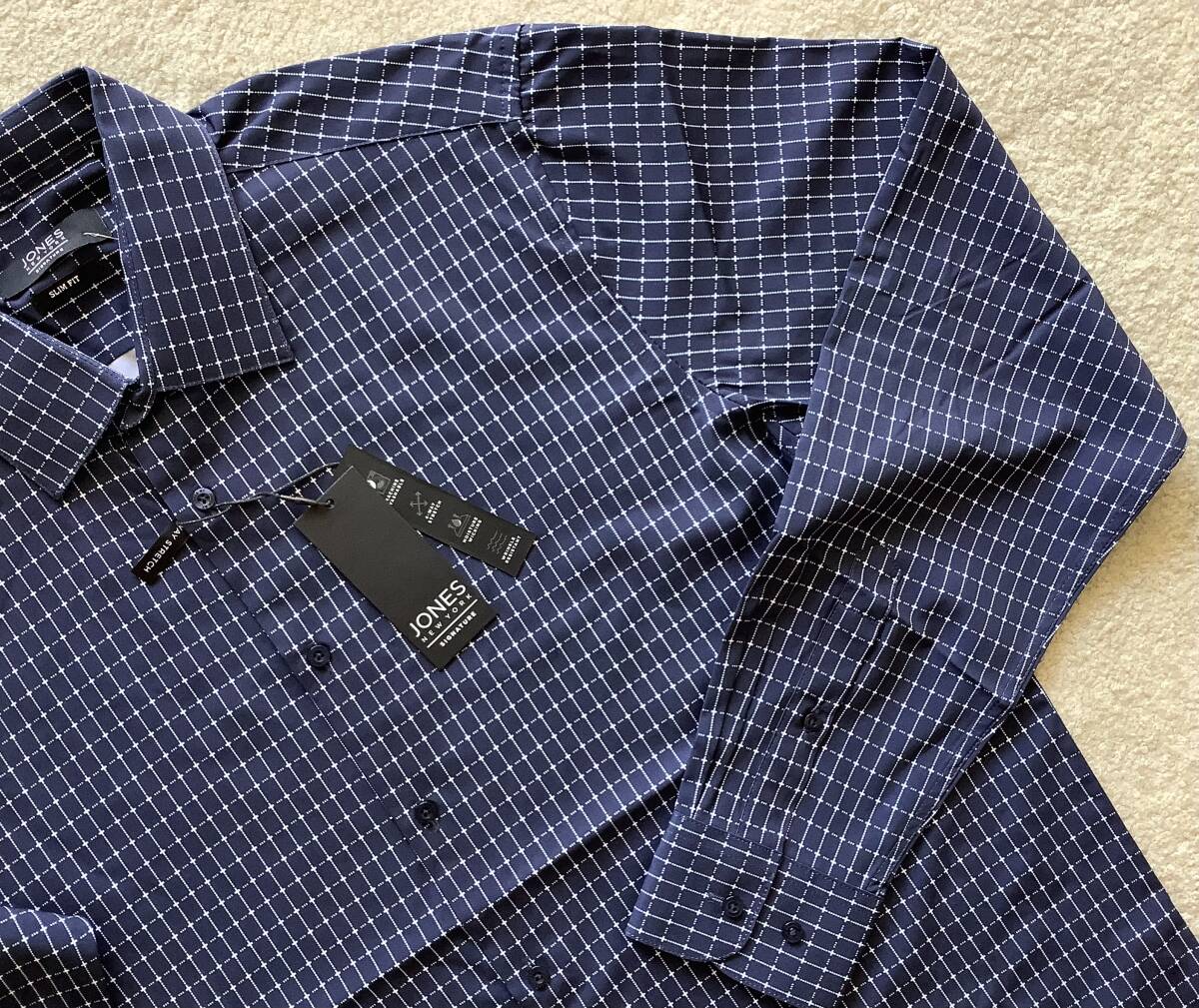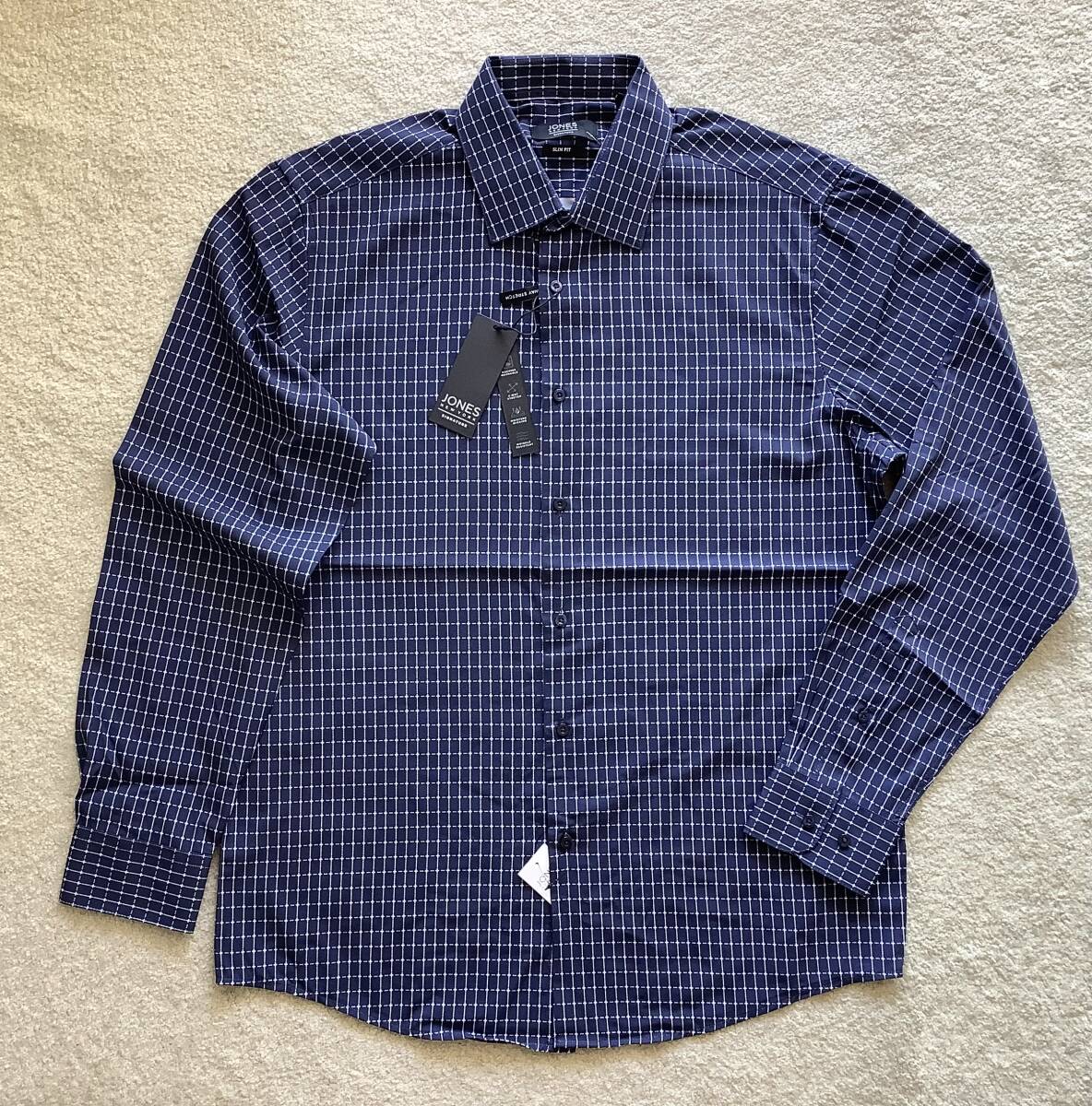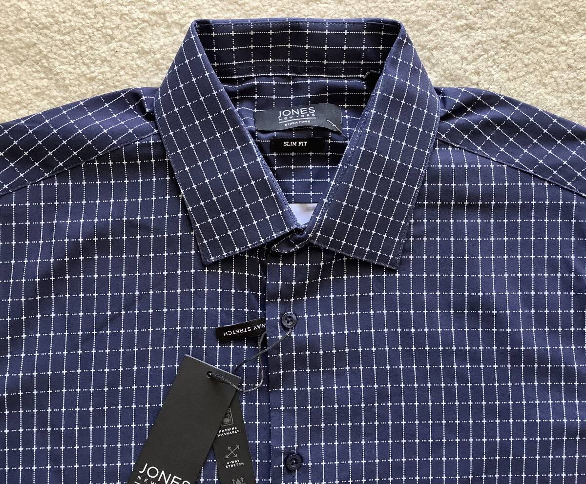 JONES NEW YORKジョーンズニューヨーク新品メンズL♪紺白チェック4Wayストレッチスリムフィットシャツ