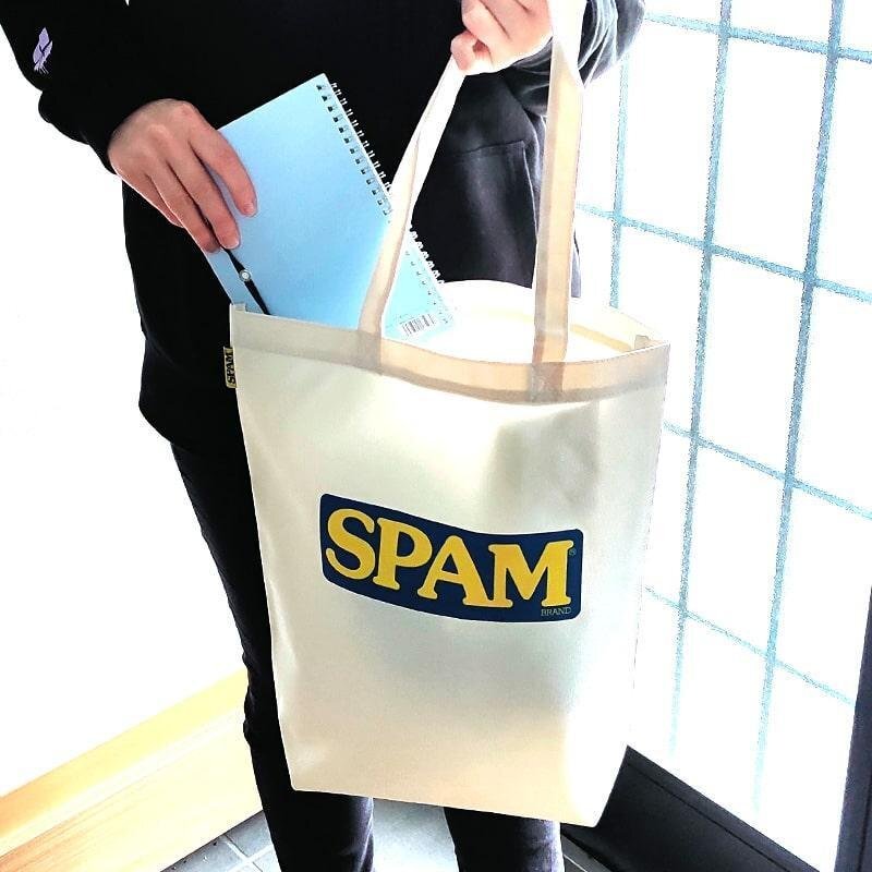 「SPAM 大容量トートバッグ」 SPAMの大容量トートバッグです。 ロゴ入りでおしゃれなデザイン。 マチありで大容量!お泊まりの荷物やトレーニングシューズも楽々入ります! 肩からかけやすい長めのショルダーがポイントです♪ シンプルなデザインなので様々なシーンに大活躍すること間違いなし! プレゼントにもいかがでしょうか。 |