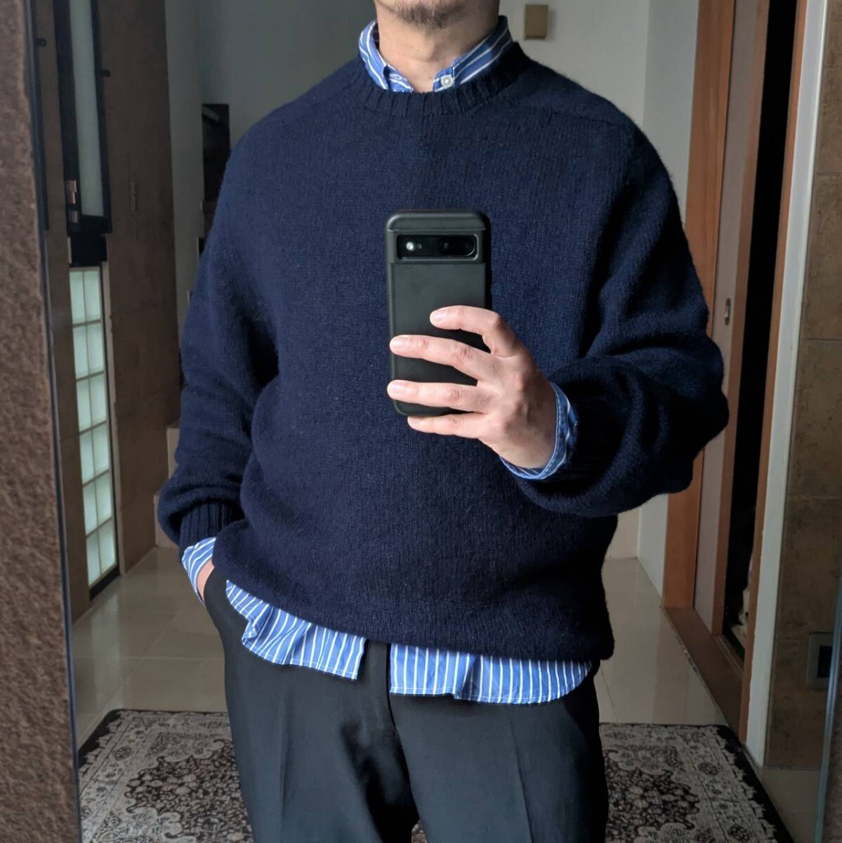 Brooks Brothersのニット。シェットランドウールを使用したニットで、セントジェームスとかそっちら辺の香りのする大人顔のニット