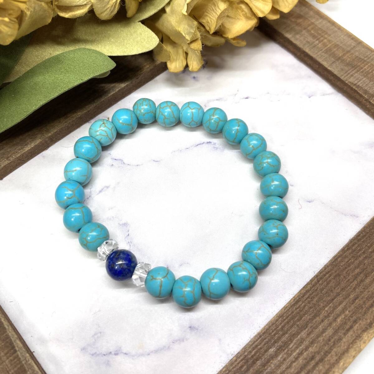 こちらは、ラピスラズリとターコイズを組み合わせた一粒ブレスレットです。石大きさ8mm玉で基本サイズは内周15cmです。プレゼントしてもいいと思います。