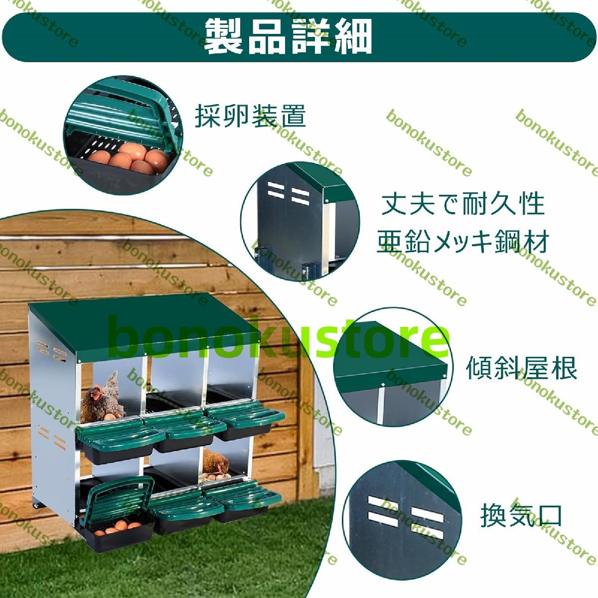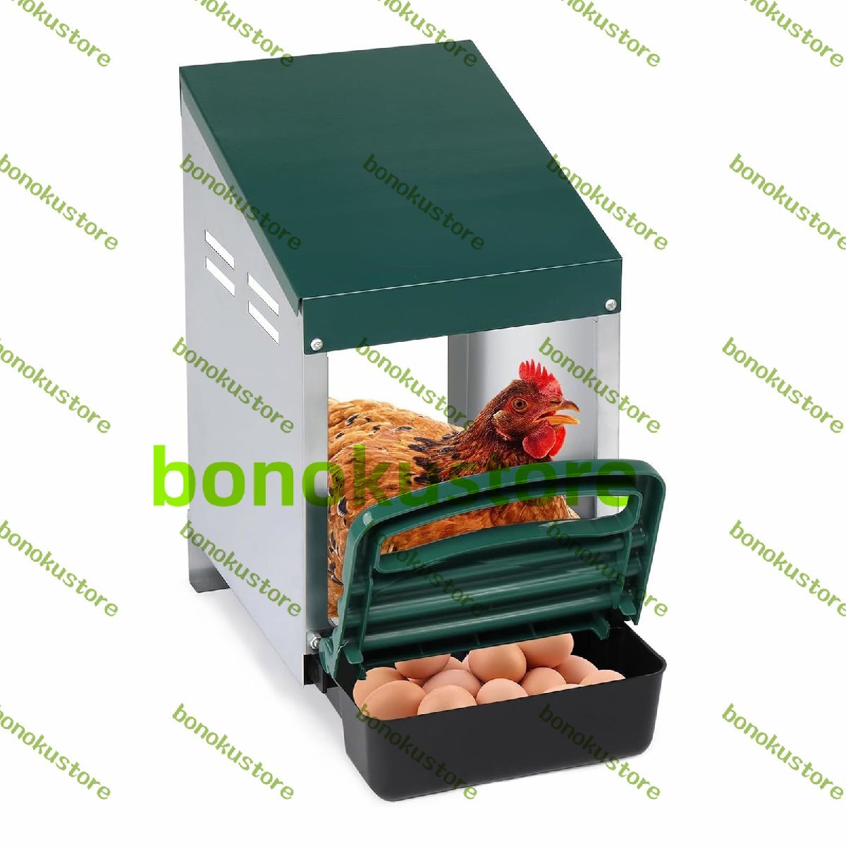 ?主な特徴:- 耐久性に優れた亜鉛メッキ鋼板は、風雨にも強いです。- 1/2/3/4/6/8/10個のコンパートメントに自動的に卵が集められ、毎日新鮮な卵を収穫できます。- 蓋付きの箱は、鶏が卵を食べてしまうのを防ぎます。- 通気口が空気の流れを確保し、鶏にとって快適です。- 壁掛けまたは地面置きなど、様々な設置方法に対応しています。材質:亜鉛メッキ鋼板注意事項:設置手順をステップごとにご説明いたします。作業を始める前に、必要な部品がすべて揃っていることを確認してください。ご購入前に、巣箱の数とサイズが鶏の群れに適していることを確認してください。通常、鶏同士の競争を最小限に抑えるため、各鶏には専用のスペースが必要です。鶏のストレスを軽減するため、騒がしい場所や人通りの多い場所は避け、巣箱が安定して固定されていることを確認してください。