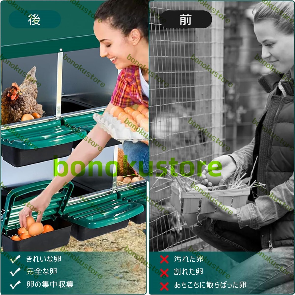 [革新的な集卵システム] 傾斜した鶏用巣箱は、卵が前面の収納部に安全に転がり込み、破損のリスクを軽減します。この独自の機能により、集卵プロセスが簡素化され、高品質の卵を簡単に集めることができます。清潔で安全な産卵環境を提供することで、これらの傾斜した巣箱は鶏にとって快適な空間を作り出し、鶏の健康と産卵効率の両方を向上させます。