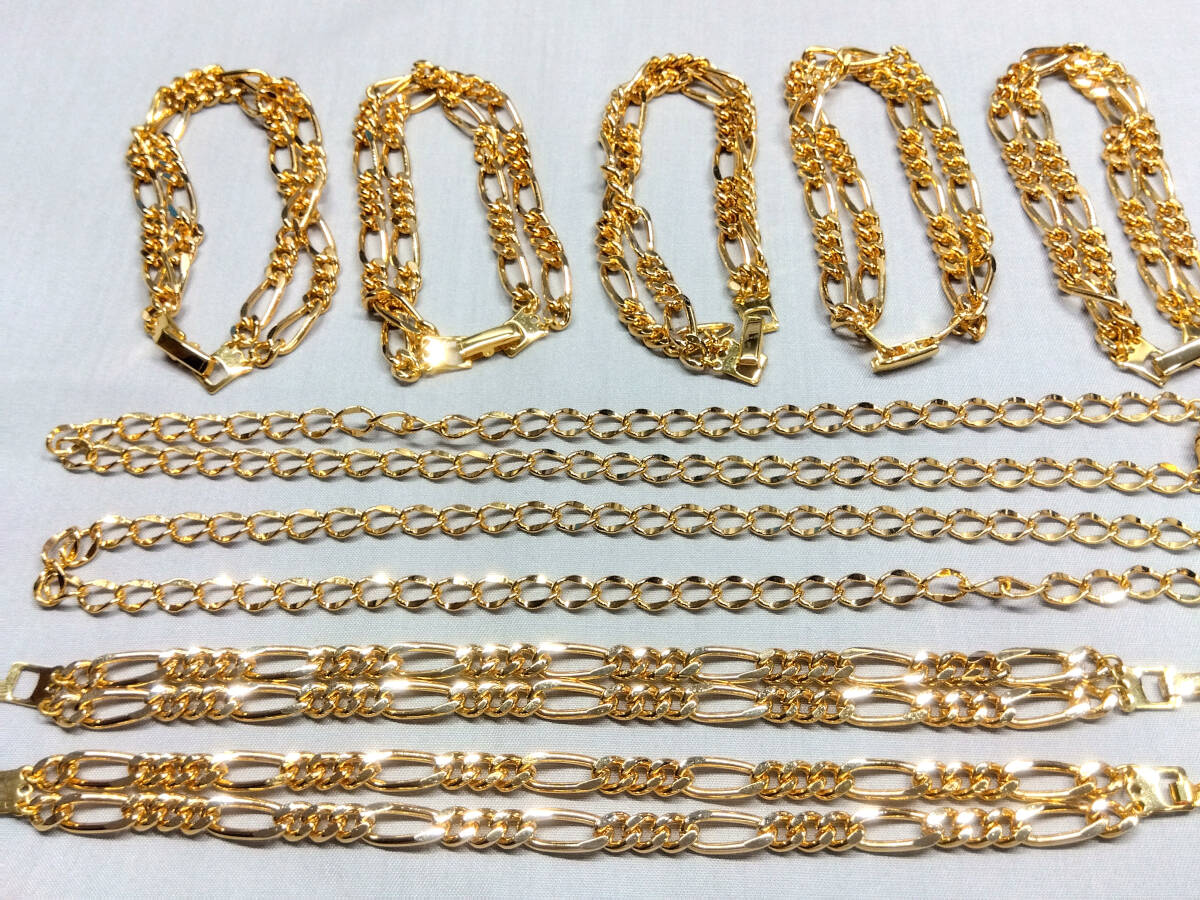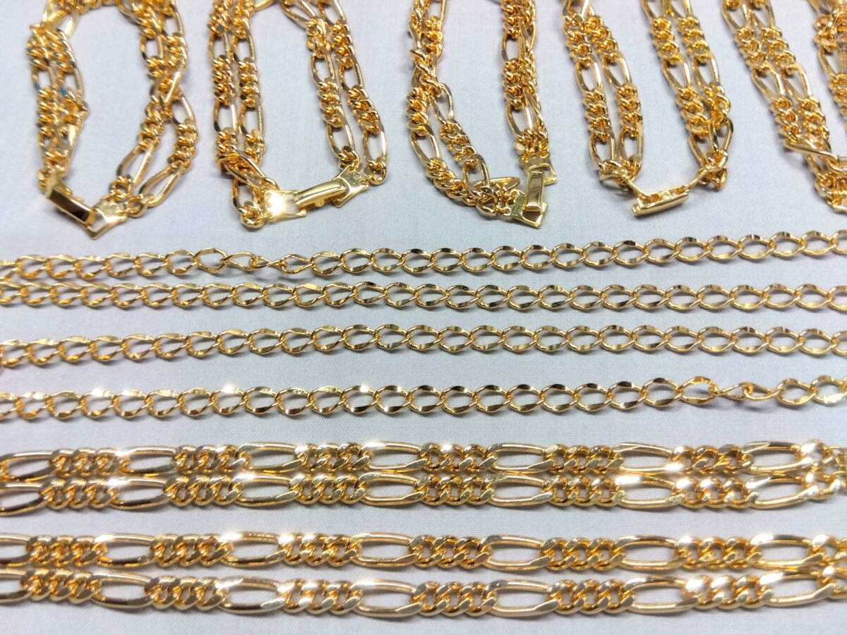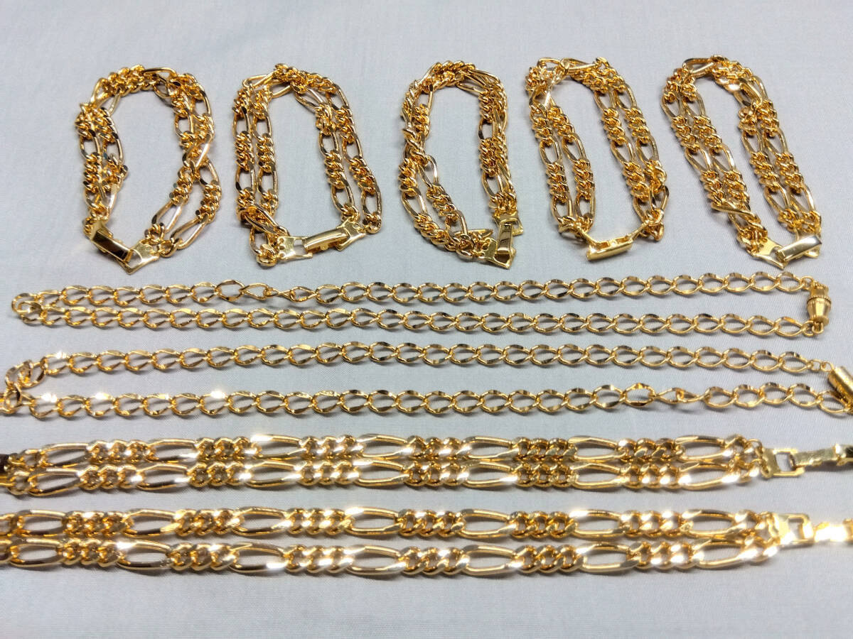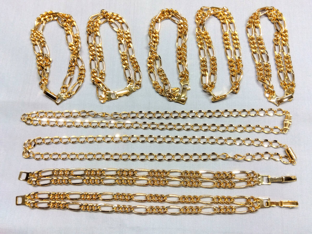 商品の ご説明 真鍮 ゴールドメッキ 二連 ブレスレット 7組 鎖部分 17cm 金具部分 3cm ネックレス 2本 チェーン部分 41cm 30年前の仕上がりです。が袋詰めしてましたので 輝きも有りますが、 丸カンのみ劣化気味です。 | ||