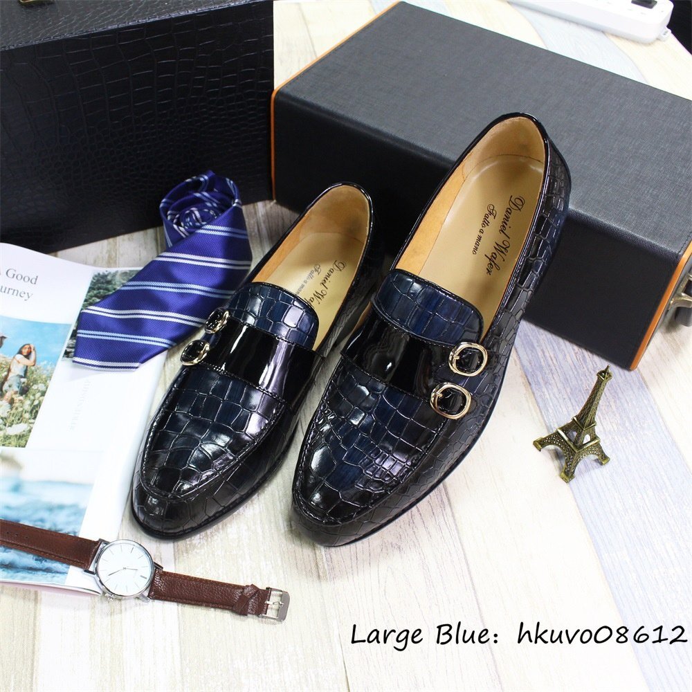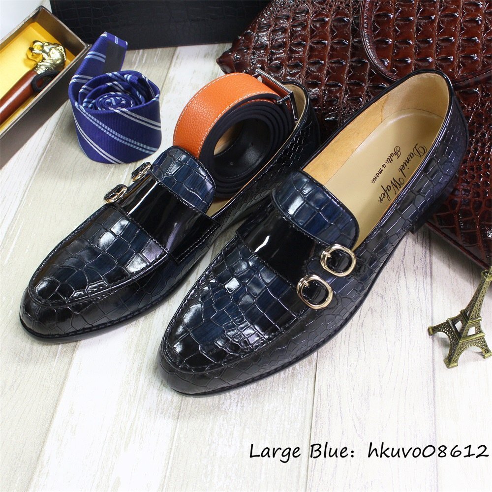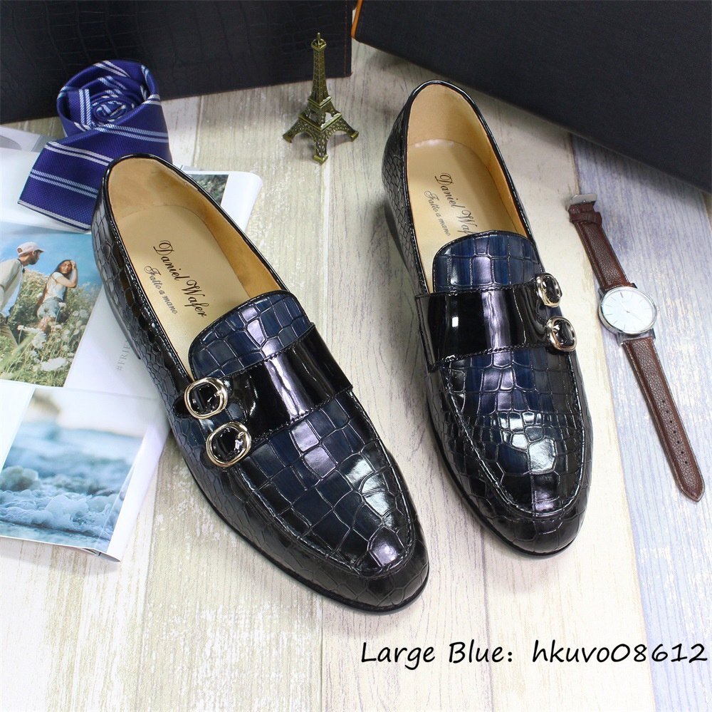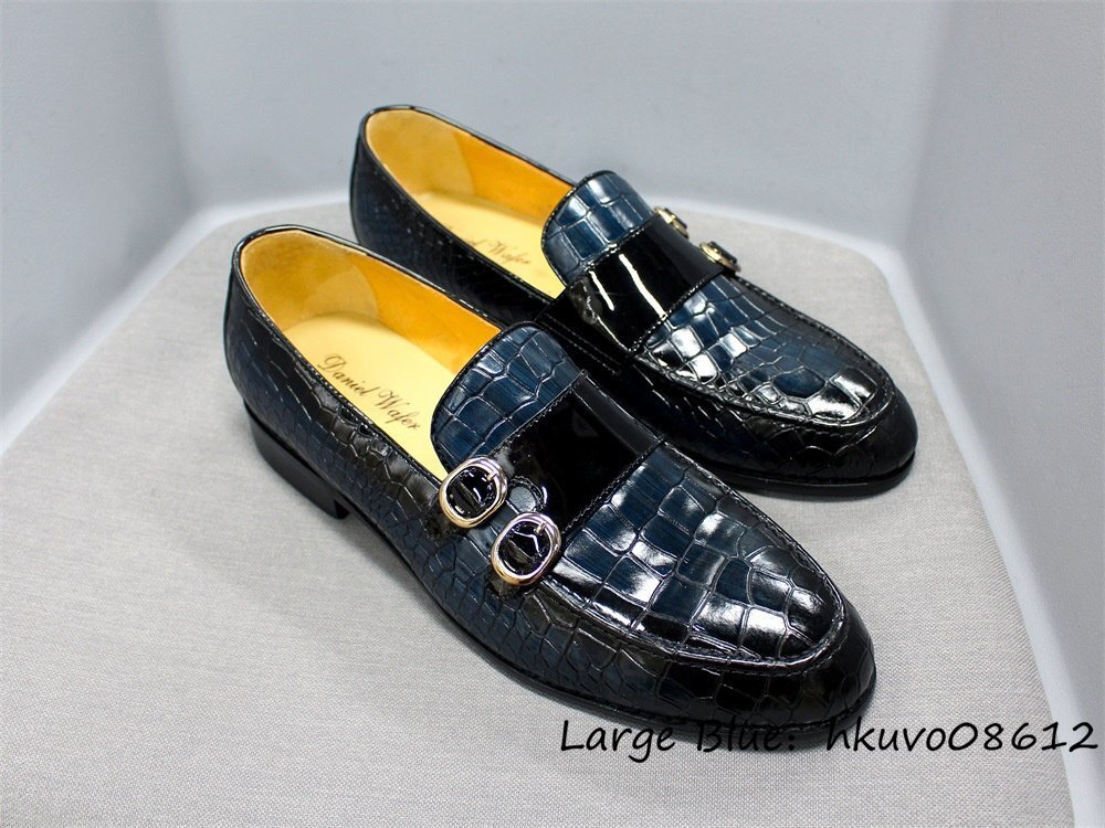 超希少★ダブルモンクストラップ 本革 鰐柄 職人手作り ビジネスシューズ メンズ レザーシューズ 牛革 紳士靴 スリッポン ブルー 24.5cm