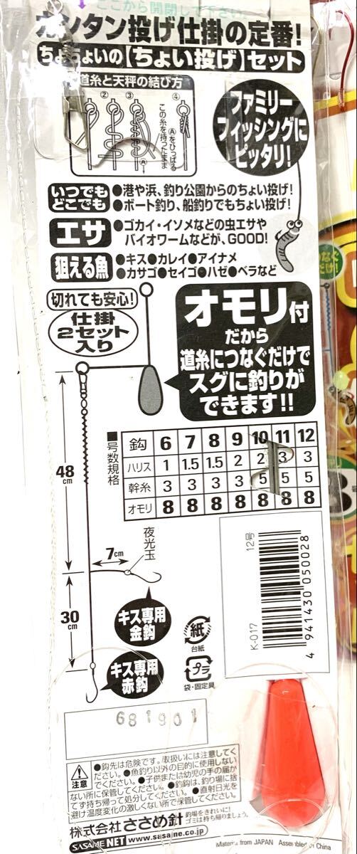 オモリと仕掛鈎セット済みなので道糸に繋ぐだけですぐに釣りができます。スペア仕掛付き。