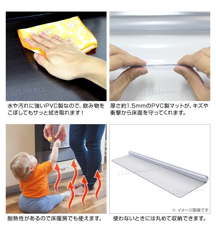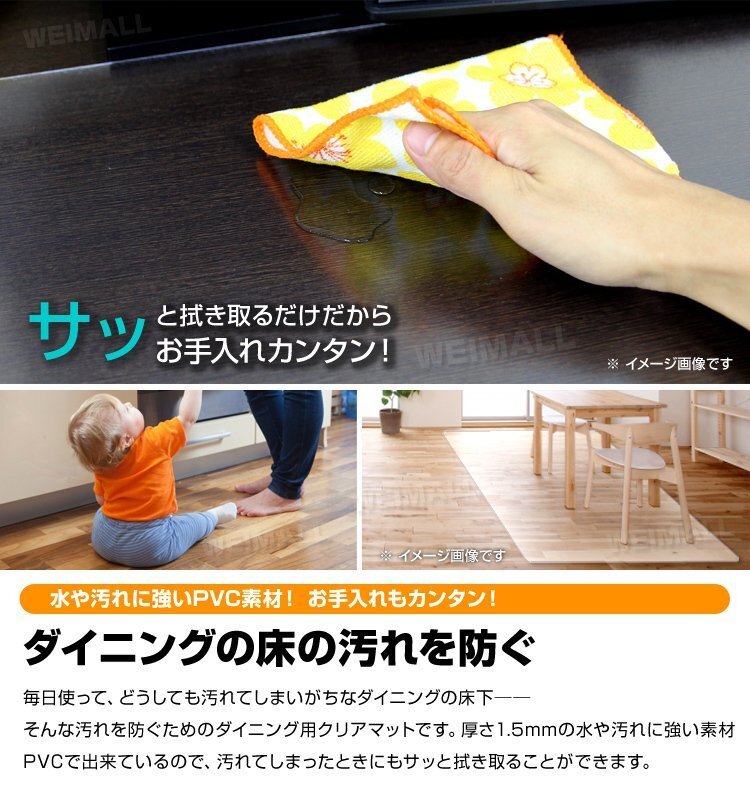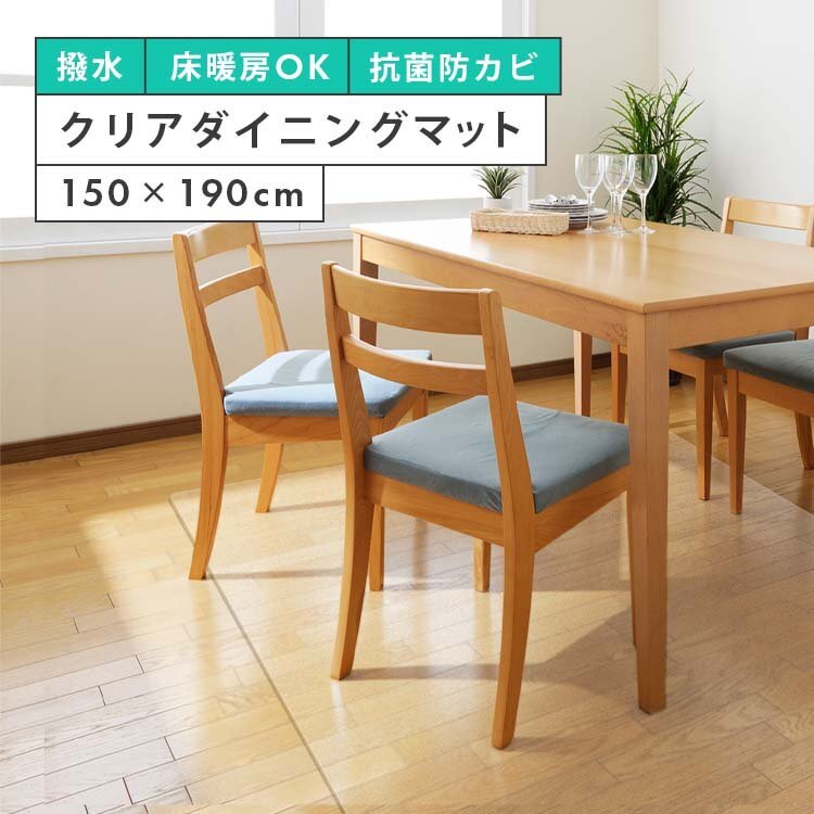 汚れがついてもサッと拭ける。クリアなダイニングマットです。 毎日使っているとどうしても汚れてしまいがちなダイニングの床下・・・。 そんなフローリングの汚れを防ぎつつ傷防止にも! クリアタイプなので、お部屋のイメージを損ねない!! 耐熱性があるので床暖房の上でも使用OK! ハサミで簡単にカットができるので、学習机の傷防止用マットなど様々なシーンで使用できます! 【商品仕様】 カラー:クリア サイズ(約):幅190cm×奥行150cm(厚さ1.5mm) 重量(約):4.85kg 材質:軟質PVC 使用温度(約):-20℃~50℃ ※お手入れは薄めた中性洗剤を湿らした布につけ、固く絞って拭いた後、水分が残らないように乾いた布で乾拭きしてください。 ※日の当たる所で使用しないでください。日焼けで硬化する場合があります。 ※商品のサイズには個体差がございます。 ※サイズが大きい場合は、お客様自身で切ってご使用いただきますようお願い致します (ダイニングマット 透明 クリアダイニングマット PVC製 ソフトタイプ 保護シート テーブル キッチン クリアマット 透明マット テーブル クリア マット ダイニングシート クリアーダイニングマット テーブルマット) |