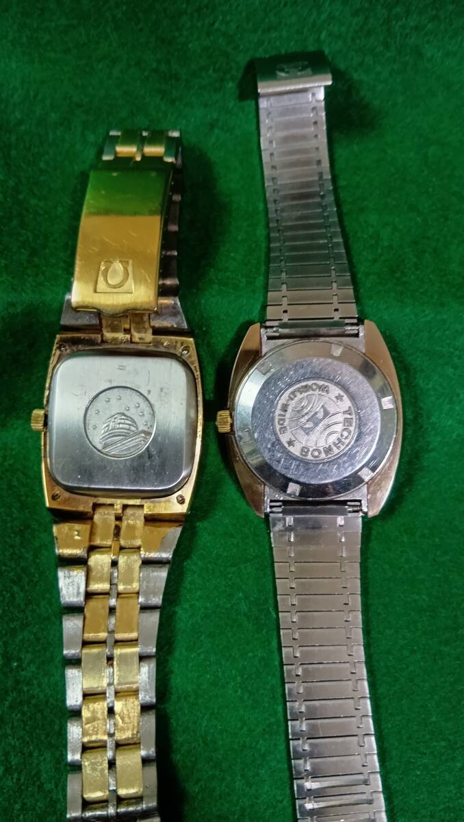 OMEGAはケ−ス、ベルトメッキはがれあり.リュウズでの時間合わせ滑っている。4時間ほぼ正確に可動しています。TECHNSは美品ですが1時間で5分進みます。2本ともJANKです。部品取りにどうですか?