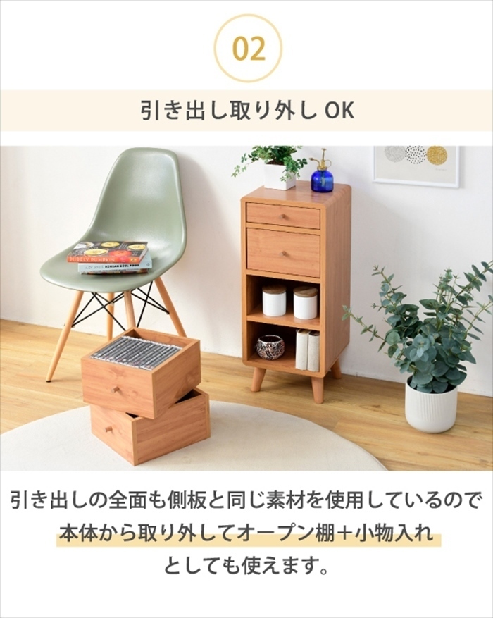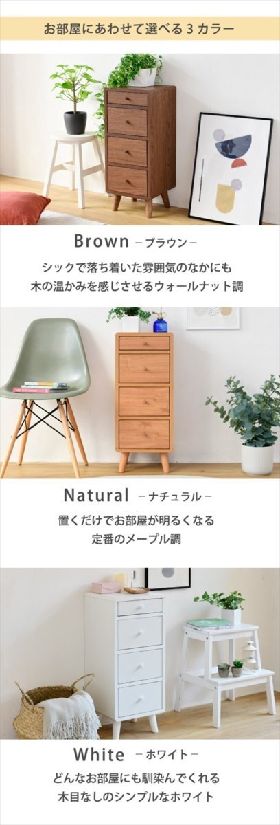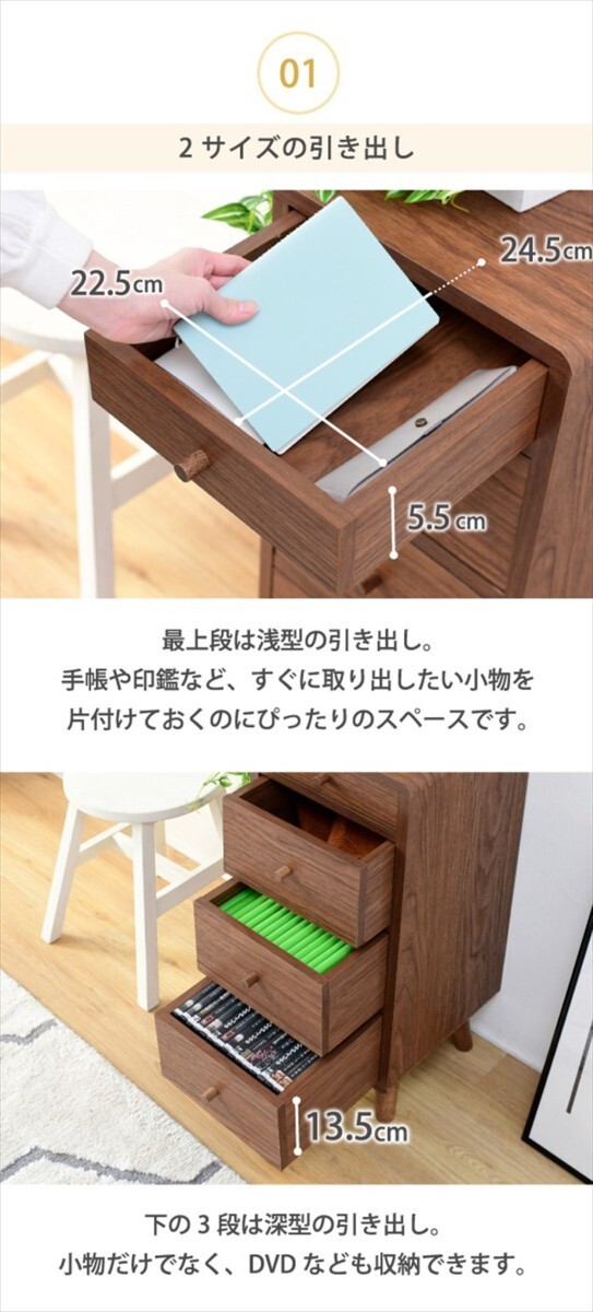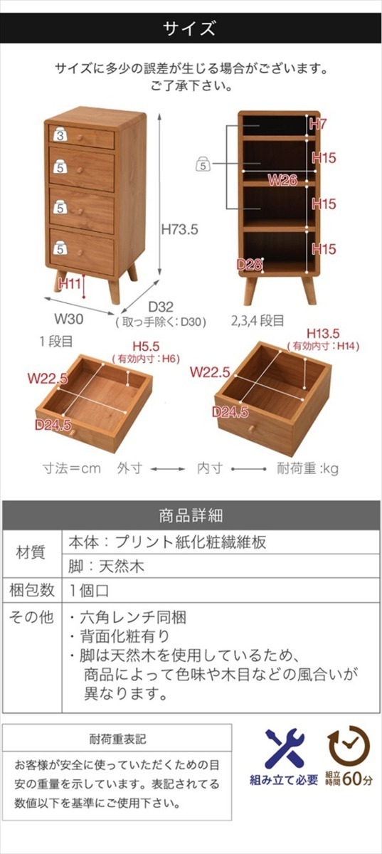 | 商品説明 | 収納するものから設計されたデザインだから、コンパクトでも機能的。 【仕様】 ▼本体サイズ [外寸]約幅30×奥行32×高さ73.5cm ▼その他サイズ [内寸] (引き出し1段目)約幅22.5×奥行24.5×高さ5.5(有効:6)cm (引き出し2~4段目)約幅22.5×奥行24.5×高さ13.5(有効:14)cm (引き出し無し:1段目)約幅26×奥行28×高さ7cm (引き出し無し:2~4段目)約幅26×奥行28×高さ15cm (脚元空間)高さ11cm ▼材質 [本体]プリント紙化粧繊維板 [脚]天然木 ▼収納量・耐荷重 [引き出し1段目]約3kg以下 [引き出し2~4段目]各約5kg以下 [オープン部]各約5kg以下 ▼備考 ・六角レンチ同梱 ・背面化粧有り ・脚は天然木を使用しているため、商品によって色味や木目などの風合いが異なります ・脚裏フェルト付き ▼生産国 マレーシア ▼組立時間(目安)(大人2人) お客様組立(60分) ▼キーワード チェスト 北欧 白 リビング 収納 脚付き ウォールナット かわいい 木 小型 シンプル 小さめ 茶色 天然木 ナチュラル 引き出し 低い 細長い 木目 四段 リビング収納 ブラウン ベッドルーム ベッド横 ウォルナット 可愛い 小物収納 サイド 木目調 たんす 木製チェスト 北欧風 木製タンス 寝室 引出し リビングラック スリムラック 隙間収納 すきま dvd |
