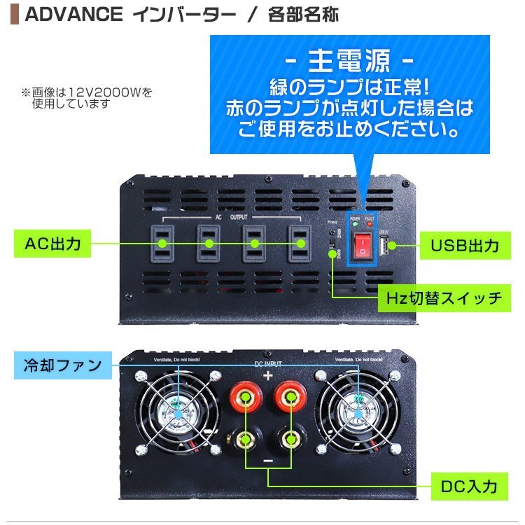 商品コード:C05A ■商品仕様 入力電圧:DC12V 出力電圧:AC100V 定格出力:2000w 最大出力:4000w 出力周波数:スイッチで50Hz/60Hz 変換可能 出力仕様:ACコンセント(4口)、USBポート(1口) 出力波形:矩形波(疑似正弦波) 本体サイズ(約):43×20×10cm 重量(約):3.65kg ケース:アルミ製 ■商品機能 回路保護 入力低電圧警報音 低電圧遮断 過温度遮断 過負荷遮断 短絡遮断 入力過電圧保護 入力逆接続保護機能 ■商品内容 インバーター本体 ×1 バッテリー接続コード 赤 ×2 バッテリー接続コード 黒 ×2 日本語取扱説明書 ■保証期間 7日間 ※商品到着後7日以内の初期不良・破損のみご対応させていただきます。 ■注意事項 ※本製品は12V車専用設計となっております。大型トラックなど24V車には絶対に使用しないでください。火災や故障の原因となります。 ※USBケーブルは付属しておりません。またUSBポートには電源供給以外の機能はありません。 ※USBハブは使用しないでください。接続機器やインバーター故障の原因となります。 ※定格出力は、すべての出力(コンセント+USB)の合計値です。 ※商品は、モニターによって色合いが異なって見える場合があります。 ※仕様・デザインは改良のため予告なく変更することがあります。 【もちろん新品未使用品です】 |