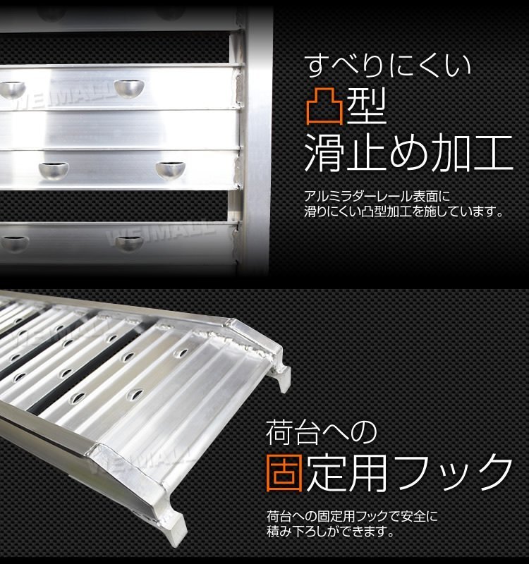 WEIMALL アルミ製 ラダーレール 折り畳み式 耐荷重(約):200kg 全長(約):1830mm Type-C 2本セット バイクから耕運機まで積み込める、 軽くて丈夫なアルミブリッジです! 踏板部分に凸型滑止め加工済! 荷台への固定フック付で安全! ※こちらの商品は、在庫切れになりやすい人気商品となりますので、 即決落札・早期ご入金を推奨しております。 |