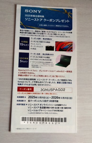 『SONY 2025年 株主様特典 ソニーストアクーポンプレゼント』です。