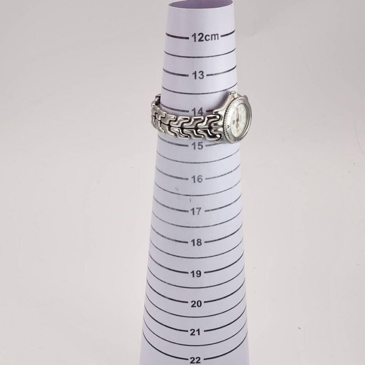 ホワイトダイヤルと特徴的なリンクブレスが魅力のクォーツ式メンズウォッチです。