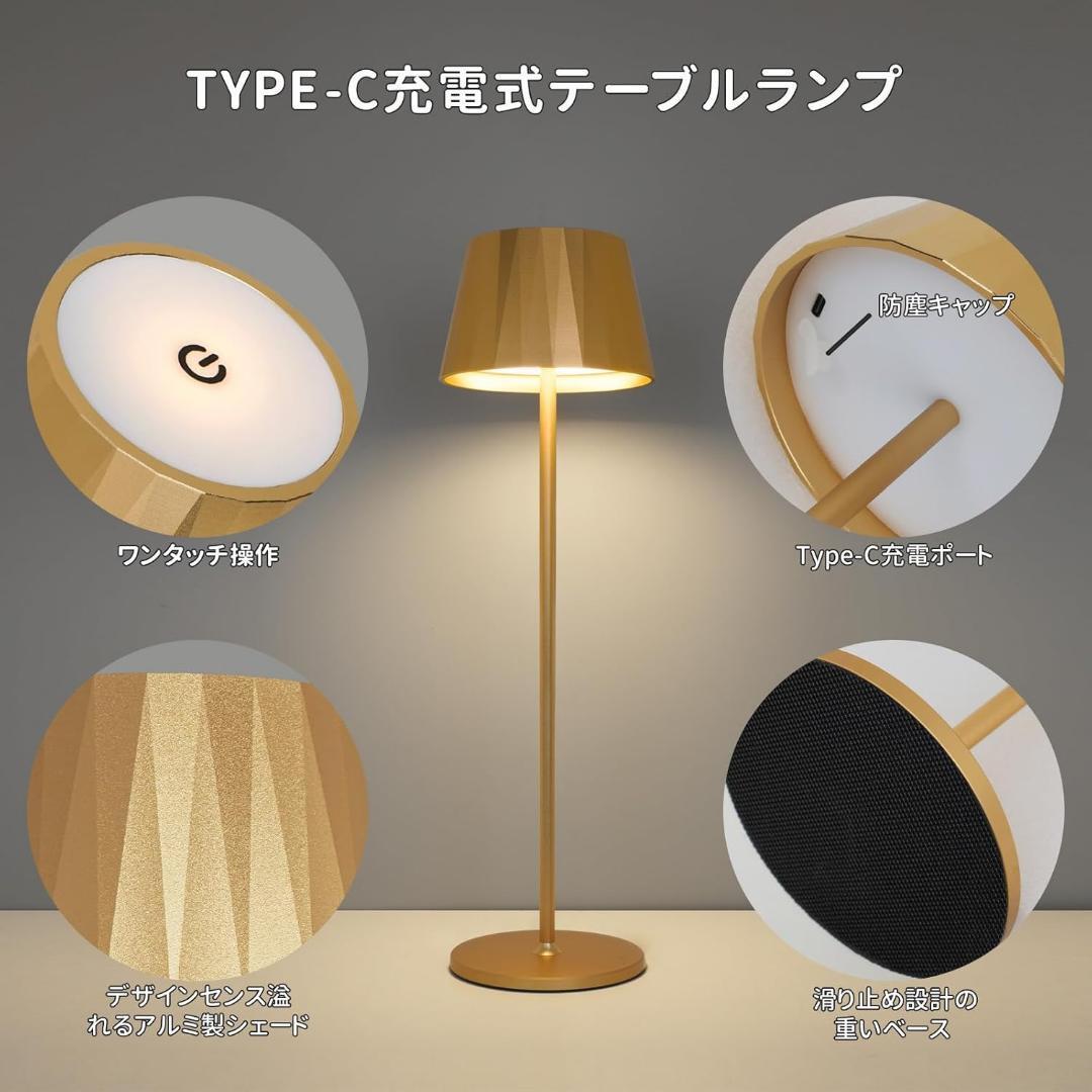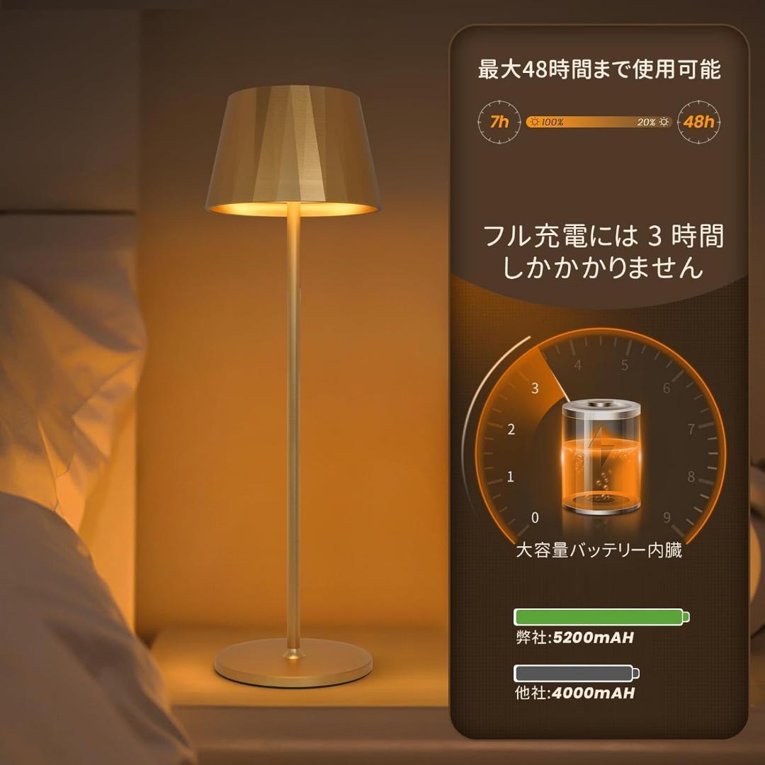 Type-C充電式テーブルランプは5200mAHバッテリーを内蔵されて、最高電力で8時間、最低電力で48時間まで使用可能になります。Type-C急速充電なので、フル充電には3時間しかかかりません。