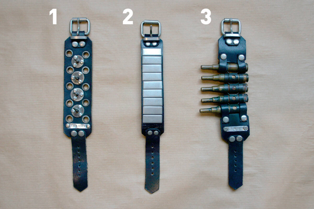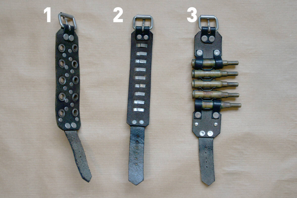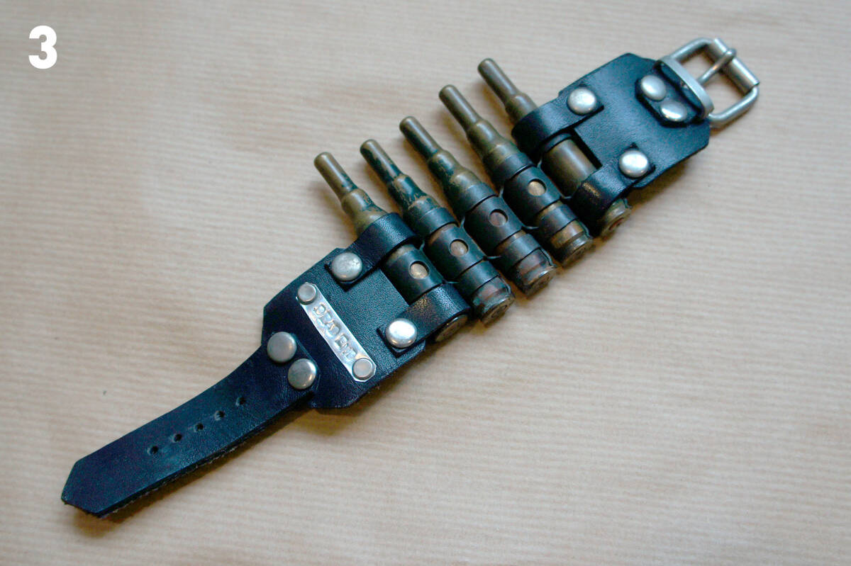 3 薬莢リストバンド こちらも本体は本革製で、革のコンディションは悪くないです(使用感はあります)。薬莢に緑青が出ておりましたが軽く拭き取りました。まだ緑色に見える箇所がありますが、モスグリーンのペイントが施されているためです。他薬莢や金属パーツに錆やくすみがあります。