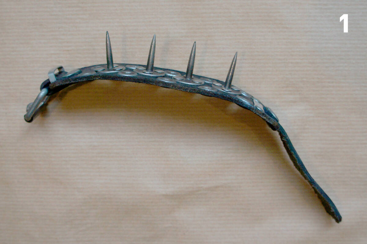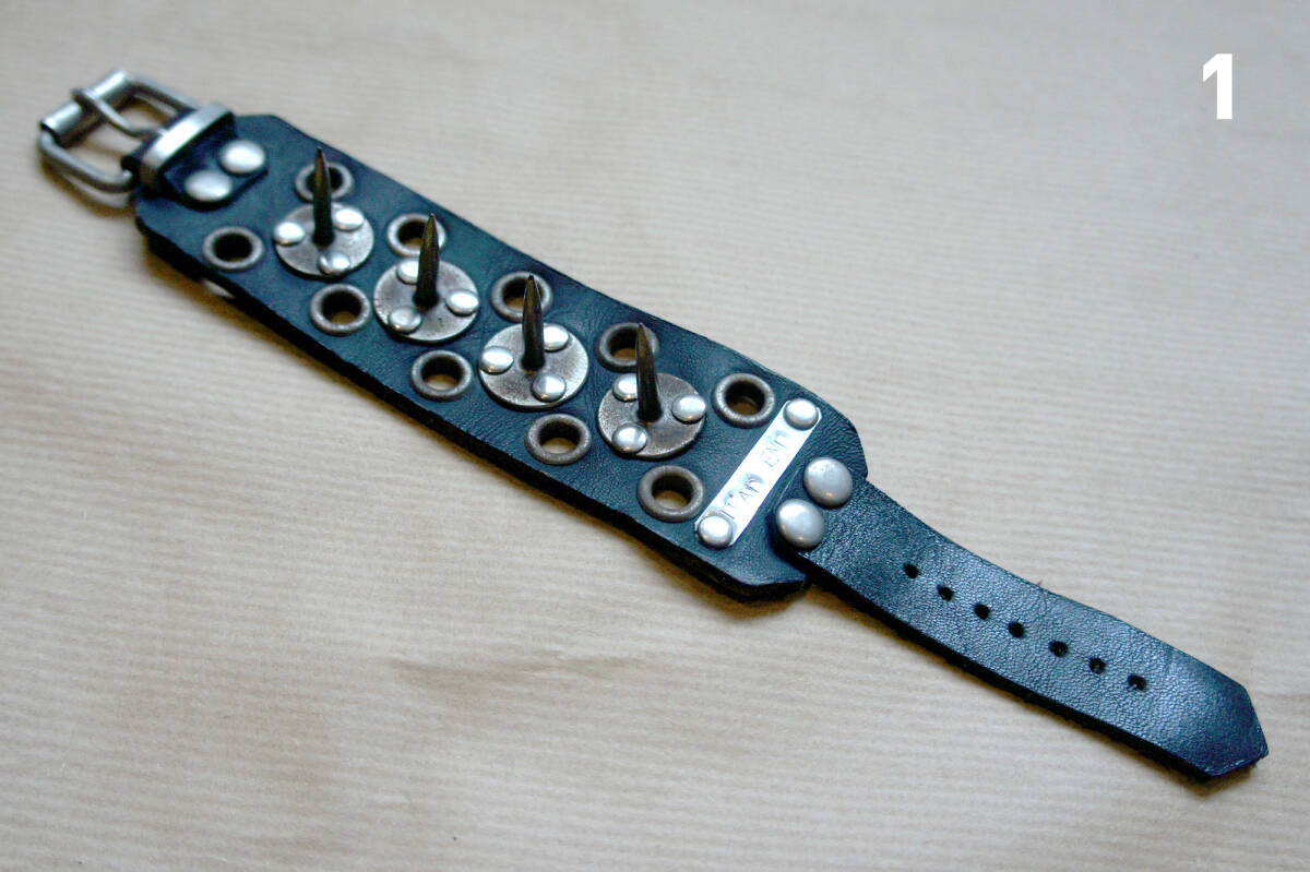 1 スタッド・リストバンド 鋲と言うよりもクギに近いような過激なデザインで、当時のDEAD ENDならではの個性的な物です。鋲や金属パーツに錆やくすみがあります。本体は本革製。革のコンディションは悪くないです(使用感はあります)。