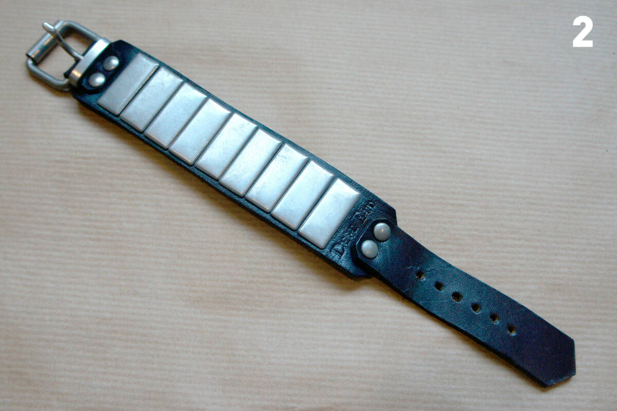 2 メタルプレート・リストバンド パンクやメタル以外の普段使いでも着用できそうなカジュアルなデザインで、こちらも本体は本革製で、革のコンディションは悪くないです(使用感はあります)。プレートや金属パーツに錆やくすみがあります。プレートは元々つや消しっぽい質感ですが磨けば少し光沢がでると思います。