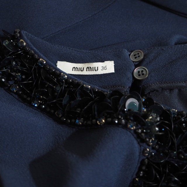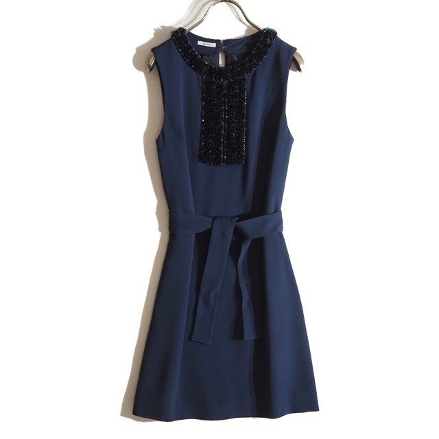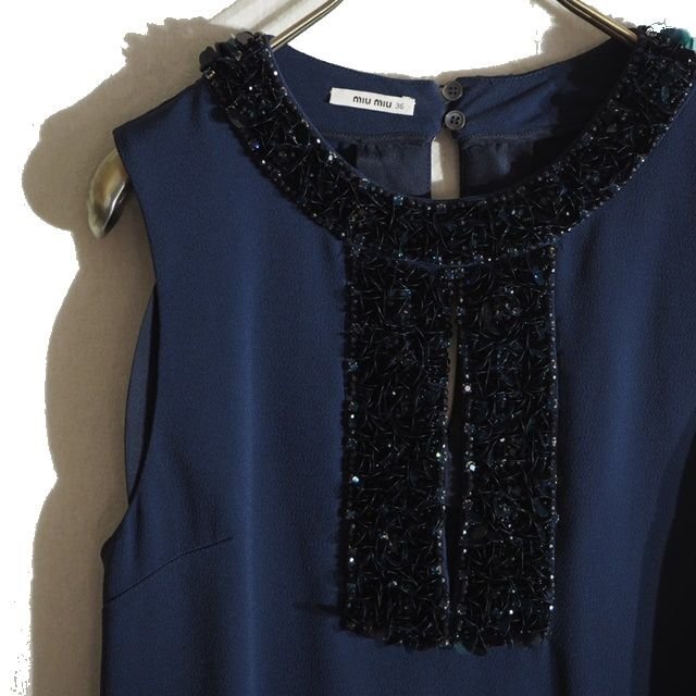 P7784H2 ▼miumiu ミュウミュウ▼ アセテート ビーズ付き ノースリーブ ドレス ミニ ワンピース ネイビー 36 / ジョーゼット 春夏
