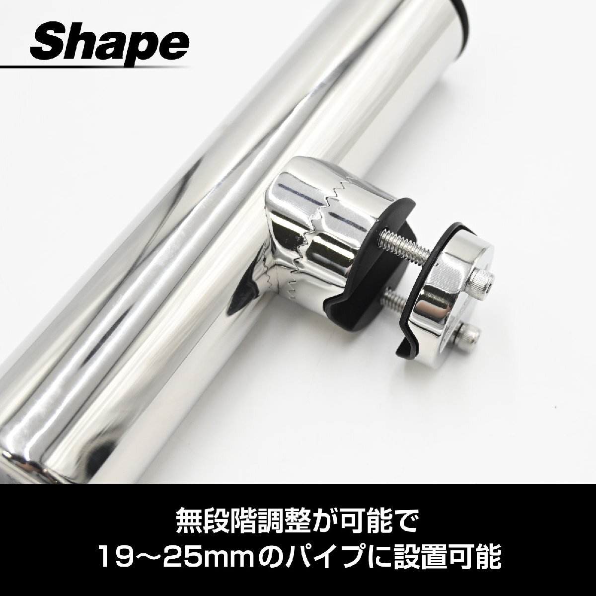 クランプオン式で19~25mmの船用パイプに簡単取付、角度は無段階調整が可能。